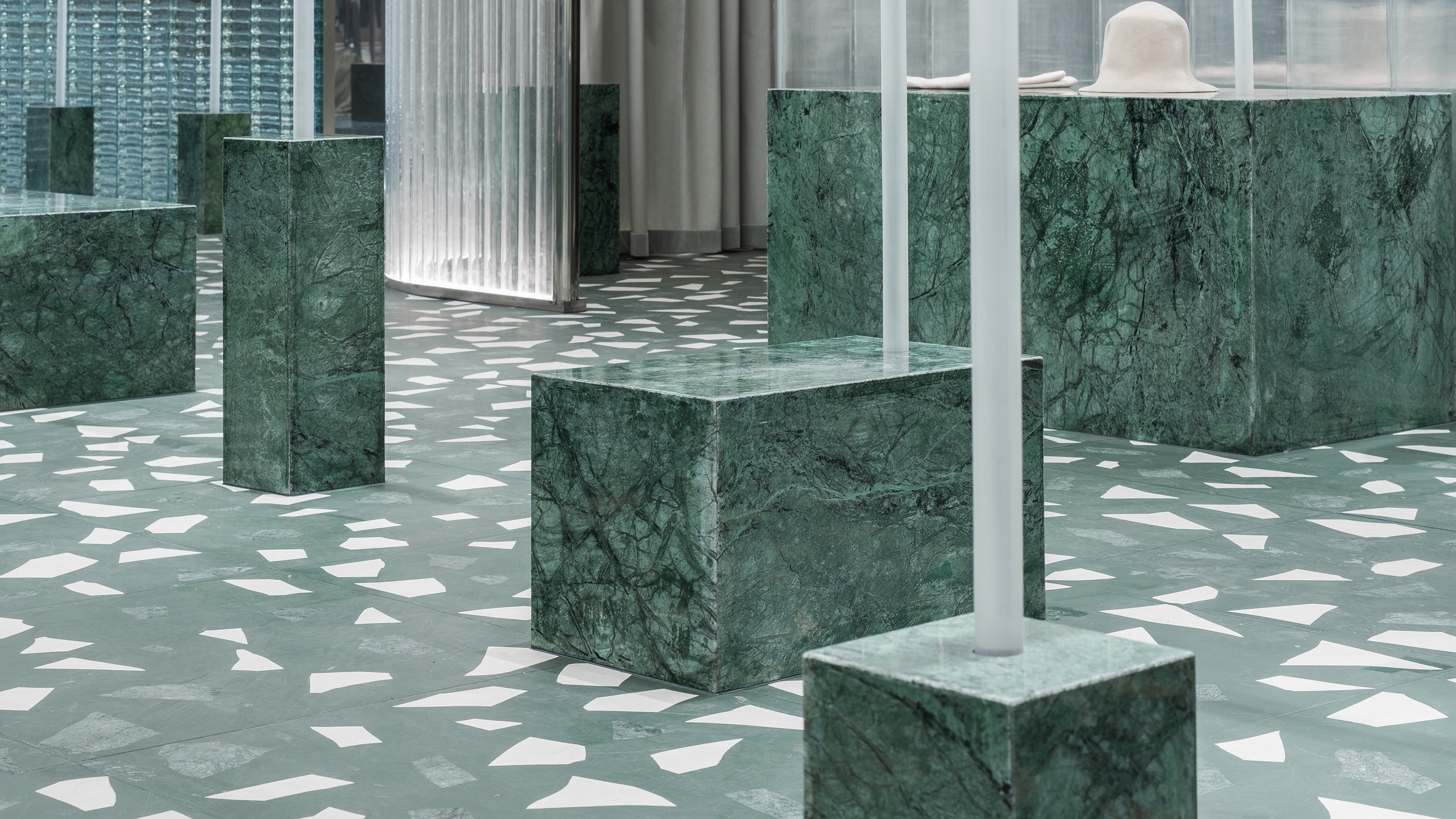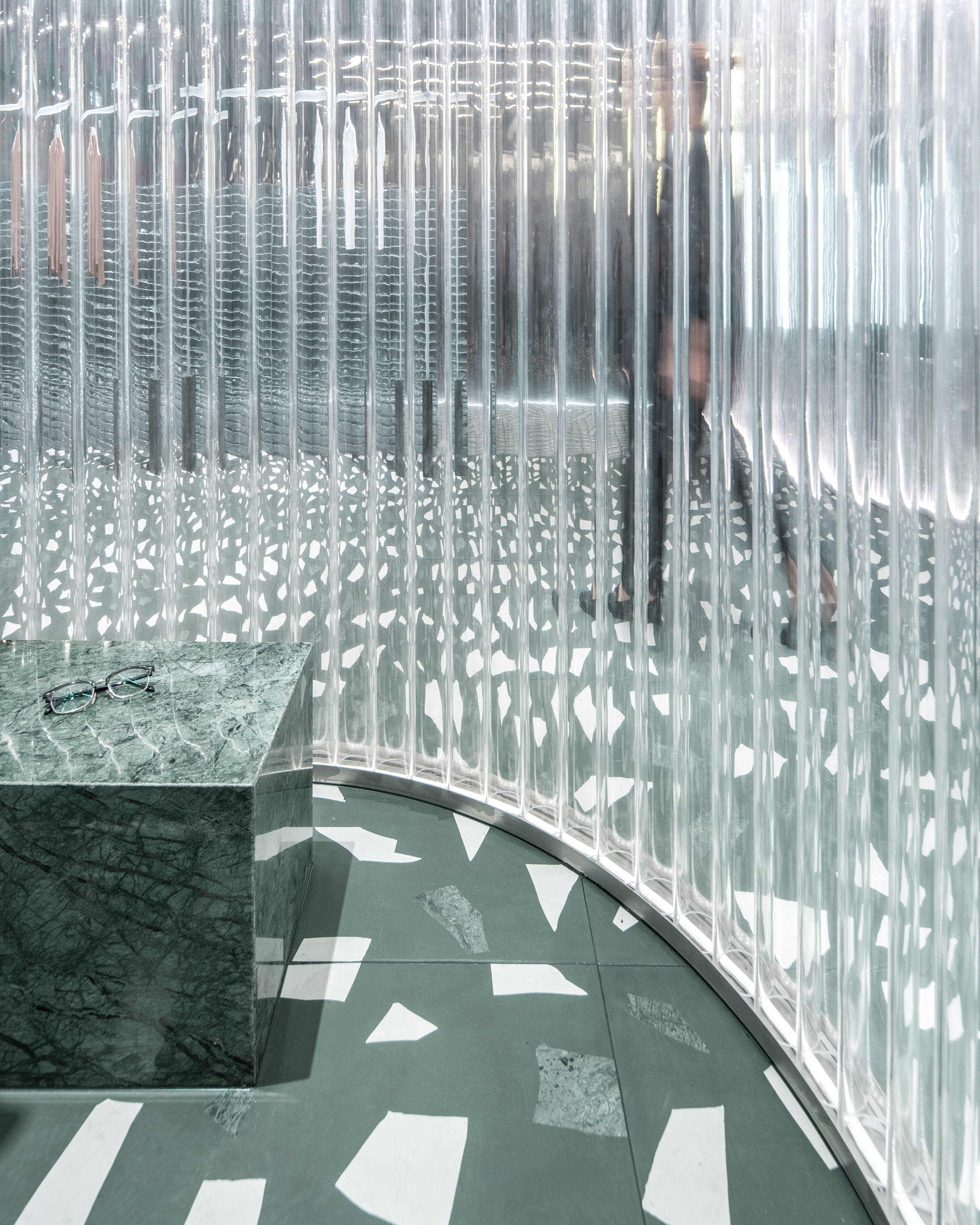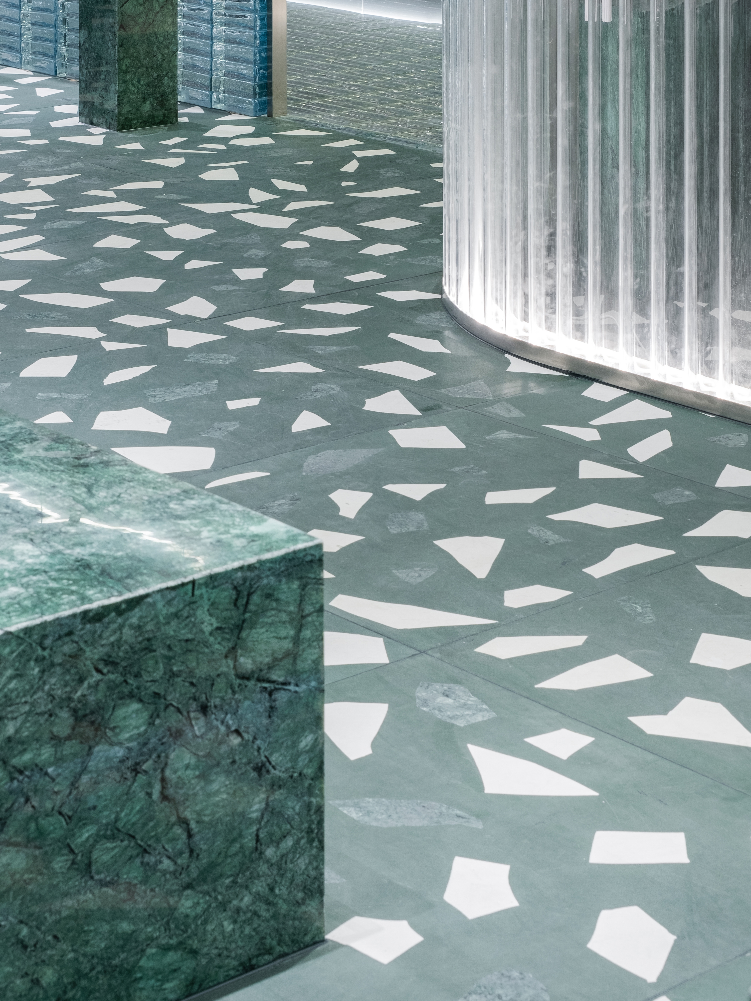 All garment hanging system is made of custom frosted acrylic rods connected with silver scaffolding metal joint that are highly adjustable and adaptable. The acrylic rods are set in a green marble base, which vary in size depending on their functionality as some are used as a display stand, bench or storage platform. The interior flooring is paved with custom greyish-green terrazzo embedded with large dark green and white marble aggregate, embodying the brand’s determination in material and craftsmanship.