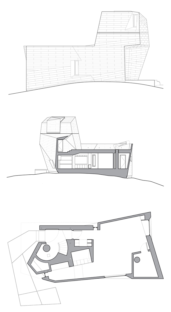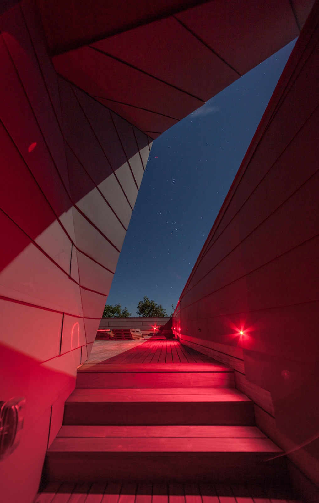 Its continuously faceted shape reflects the surrounding landform, and terraced concrete platforms transition between the summit’s bedrock and the building foundation, knitting together natural and man-made landscapes. An unconventional pattern of lock-seamed zinc cladding mediates between the irregular site topography and the building’s geometry, reflecting Gemma’s orientation to both geological and celestial landmarks.