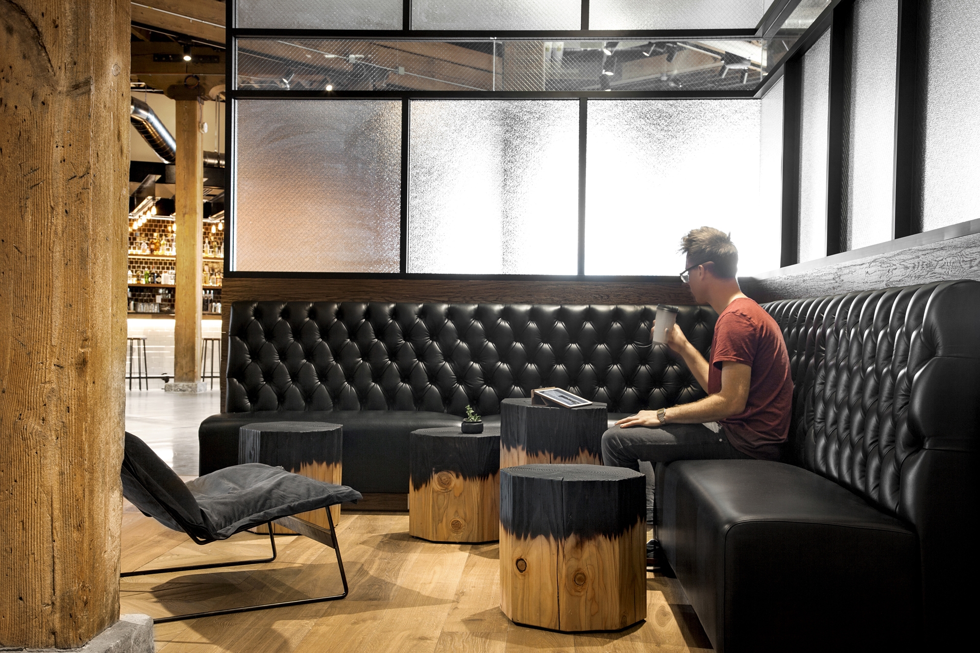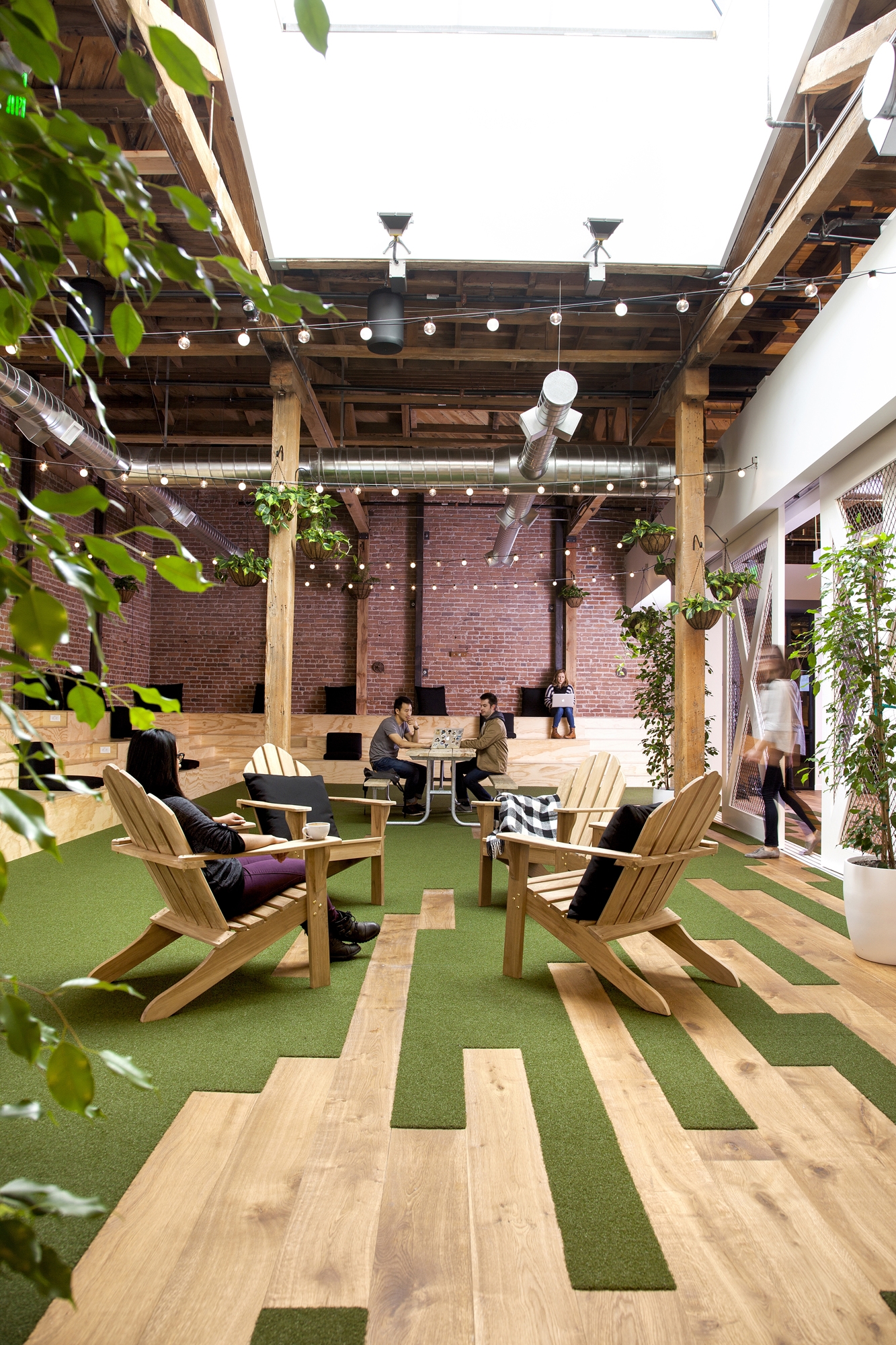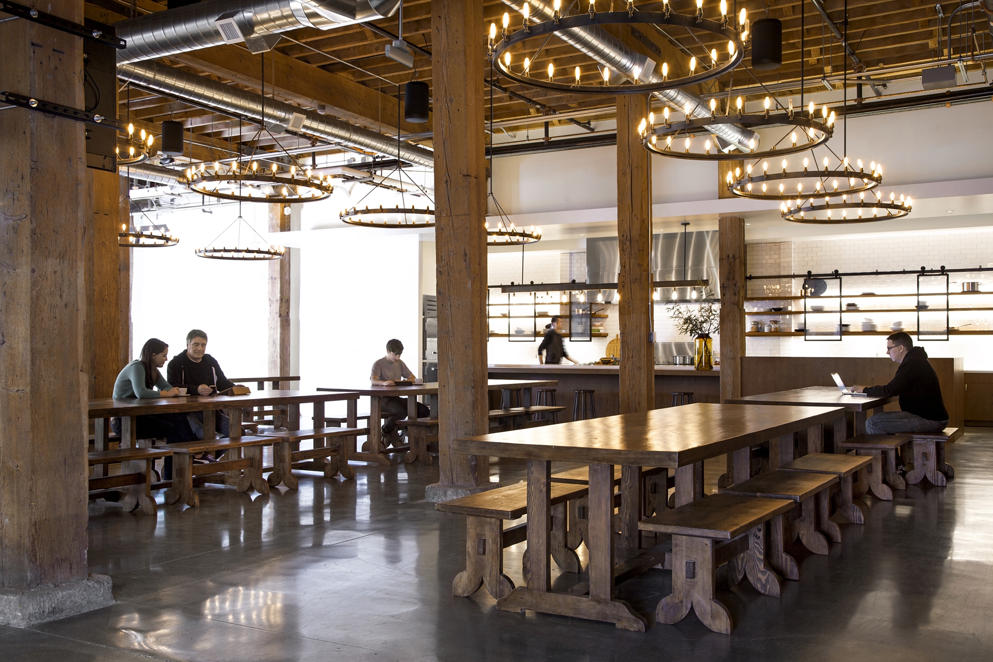 As a company founded in local cafes and bars around the city, it was important to infuse these types of environments throughout the space as a nod to the company’s roots but also to serve as alternative work settings. In addition to a café on each level, the 55,000 rentable sq.ft., three story LEED gold certified work space located in the heart of SOMA boasts a full bar, commercial kitchen, large and small (themed) conference rooms, phone rooms, a dojo, meditation room, indoor park, hidden speakeasy, library, museum, “coder caves,” kid's play ground, and a roof deck lounge.