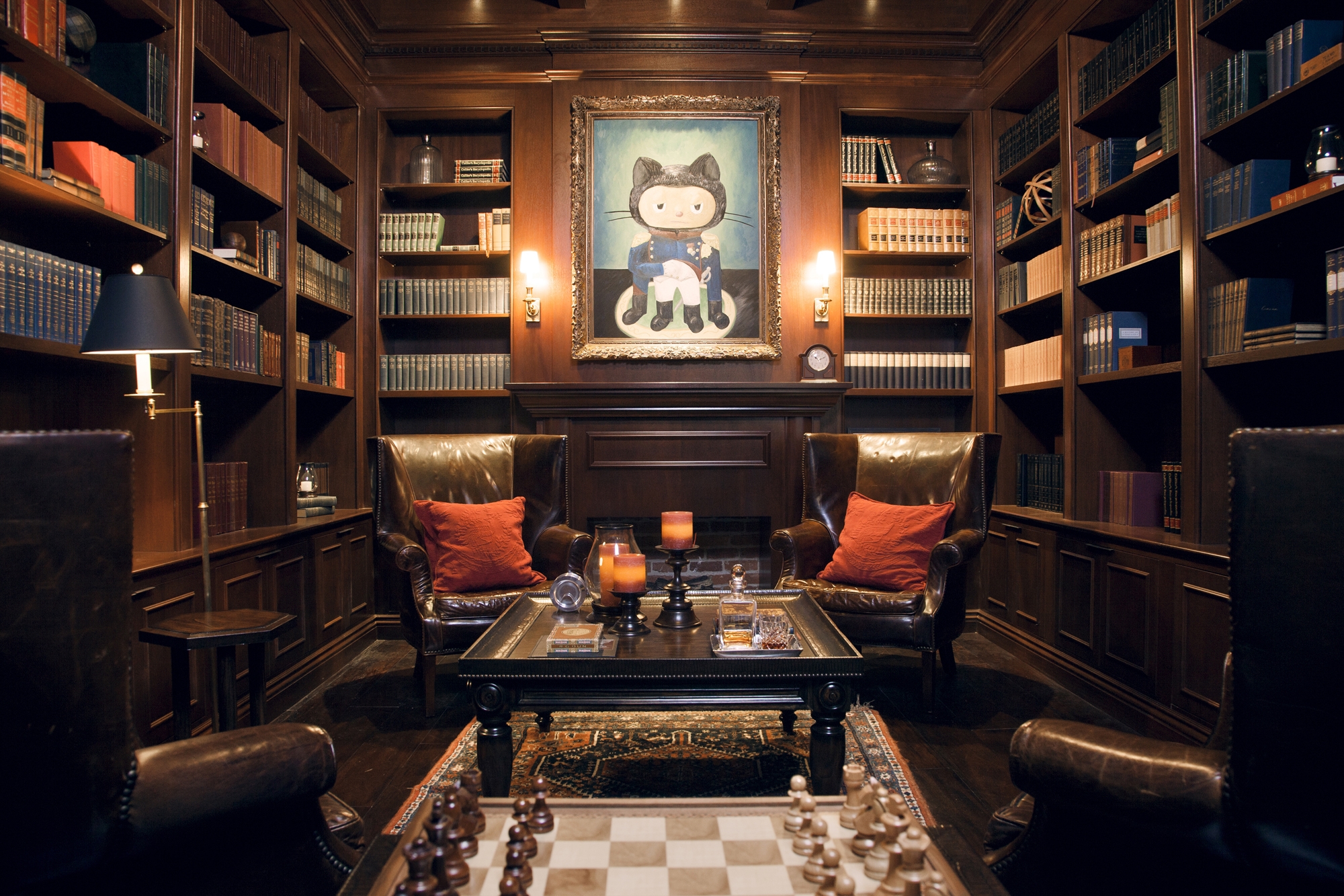 The massive first floor with a full bar, commercial kitchen and presentation area is open to non-profits and tech start-ups who are invited to host their own meetings, conferences and events. This area was designed to look and feel like a great event space embracing the hip, warm industrial aesthetic of local bars and restaurants, fully integrating it as part of the neighborhood. The design also honors the rich history of the brick and timber building that GitHub occupies through the use of five vintage shipping containers that were deconstructed and rebuilt on site as a reference to the train that rolled in and out of the ground floor when the building was a dried fruit packing warehouse in the early 1900s. A faux railroad with brass rails and stamped concrete ties was also added in the same location as the original track to reinforce the building's unique history. GitHub takes great pride in being an approachable company with a ton of personality. Their playful spirit is evident in the many themed conference rooms including the “Situation Room,” “Rat Pack” room, “Saloon,” safari themed “Game Room,” and of course the faithful replica of the Oval Office which acts as their reception. As the GitHub CEO said himself, “GitHub wants their guests to feel important” and people who sit in the actual Oval Office are pretty important!