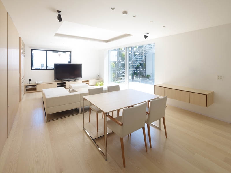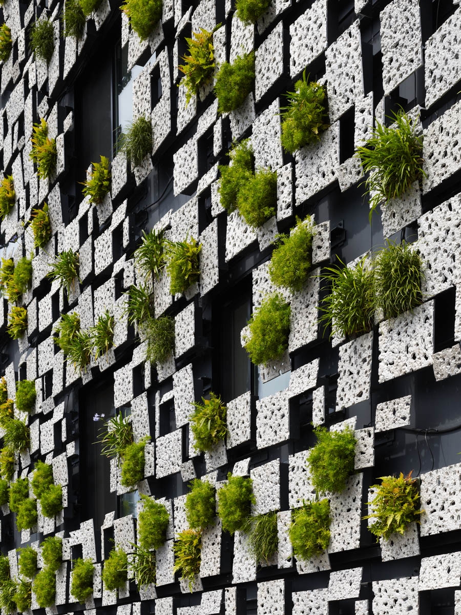 The façade of the building is covered with planters made of aluminum die-cast panels, which provides space for facilities. The 3 (up to 6) aluminum panels, which also form planters, are made in monoblock casting. Each panel is slanted, and its surface appears to be organic, of which cast comes from decayed styrene foam. Equipment such as watering hose, air reservoir for ventilation and downpipes are installed behind the panels so that the façade can accommodate a comprehensive system for the building.