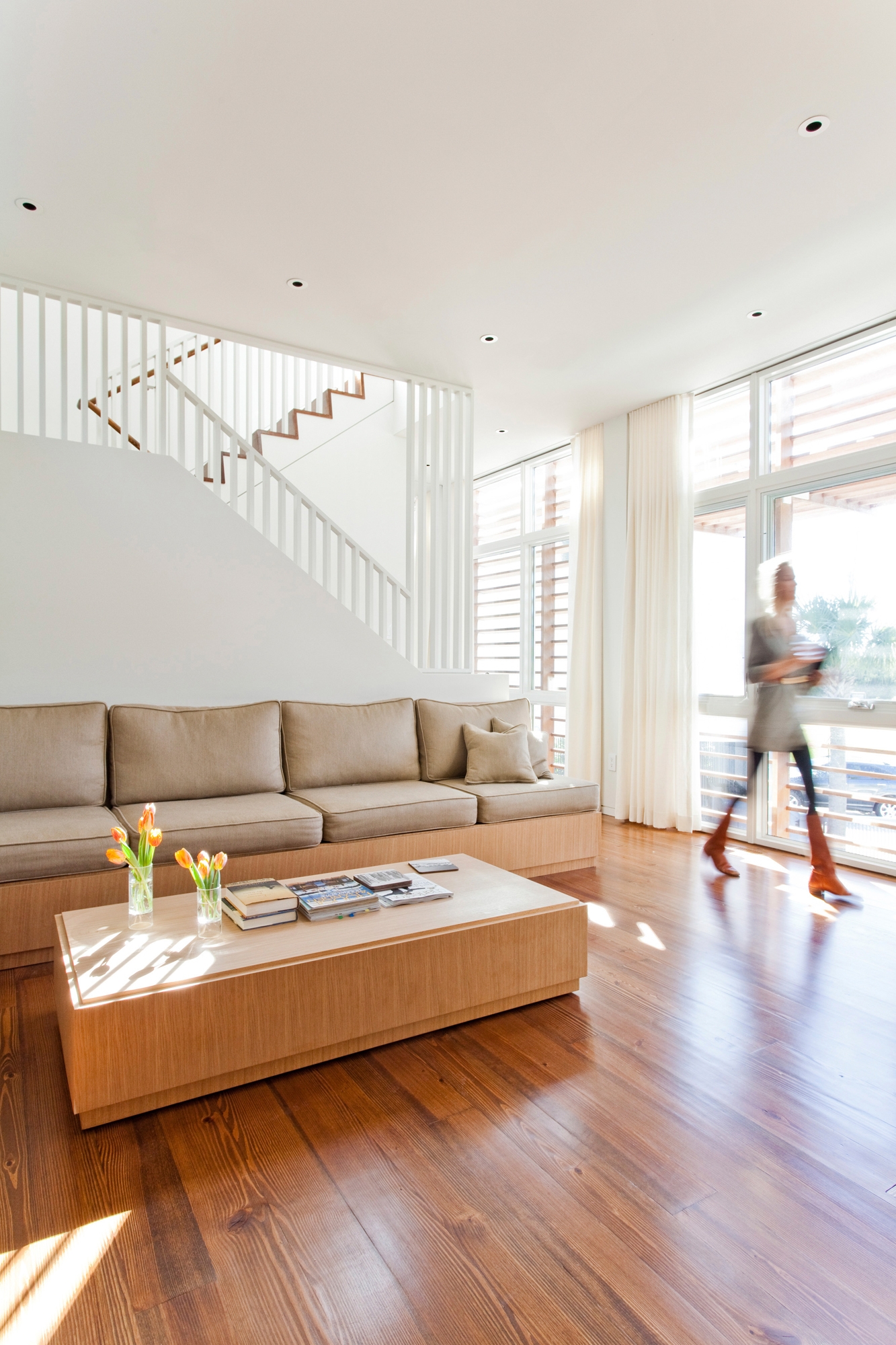 The pool-facing wall on both floors above is clad in floor to ceiling hurricane-resistant windows screened by louvers made of sustainably-harvested ipé, a tropical hard wood resistant to humidity. Despite being limited by zoning to a width of only 15 ft and a mere 1500 sf of enclosed space, the interiors feel generous due to the full-height glass wall that extends the length of the pavilion, the open layout, concealed pocket doors, and restrained palette. The site orientation, narrow width, and operable windows on each side allow for effective cross-ventilation during moderate weather. Throughout, local materials are used extensively including FSC certified cypress ceilings, Southern Pine floors, Southern Oak veneer millwork, and custom pre-cast pavers. The landscape design incorporates native plants and a minimal amount of lawn to reduce the need for extensive irrigation, and permeable pavers to reduce storm water run-off.