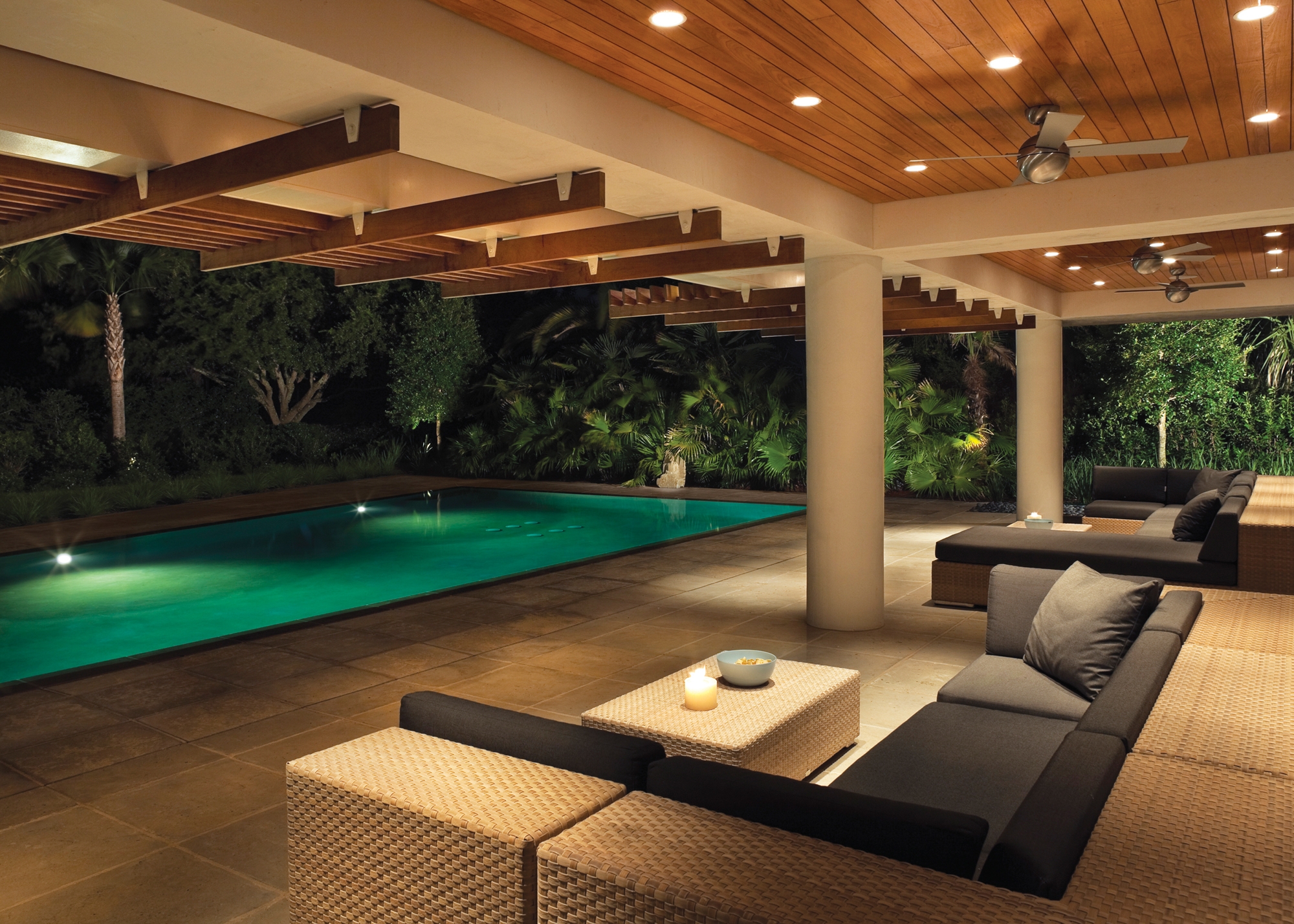 The pavilion’s structural system, a rigid steel cage without any interior support columns or walls, provides superb hurricane resistance and allows for open airy interiors. The long span of the steel framing allowed the monumental concrete support columns to be spaced far apart, creating a grand, Southern-style shaded space under the house.