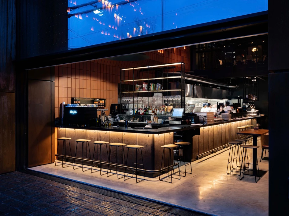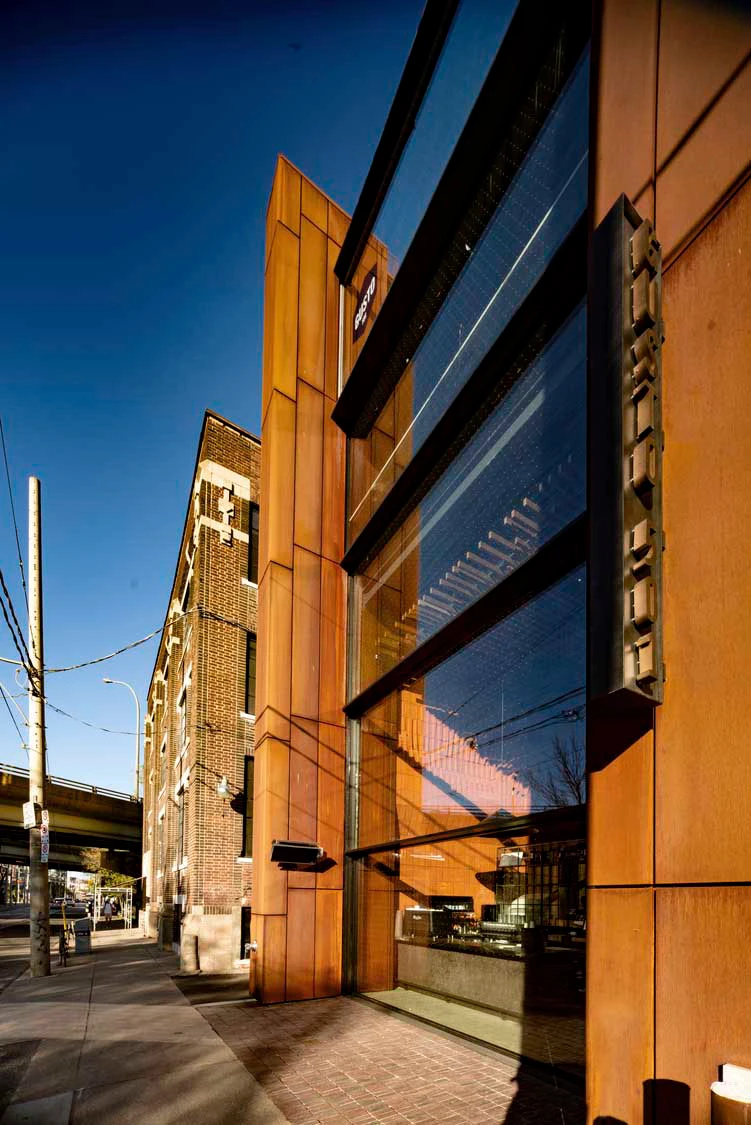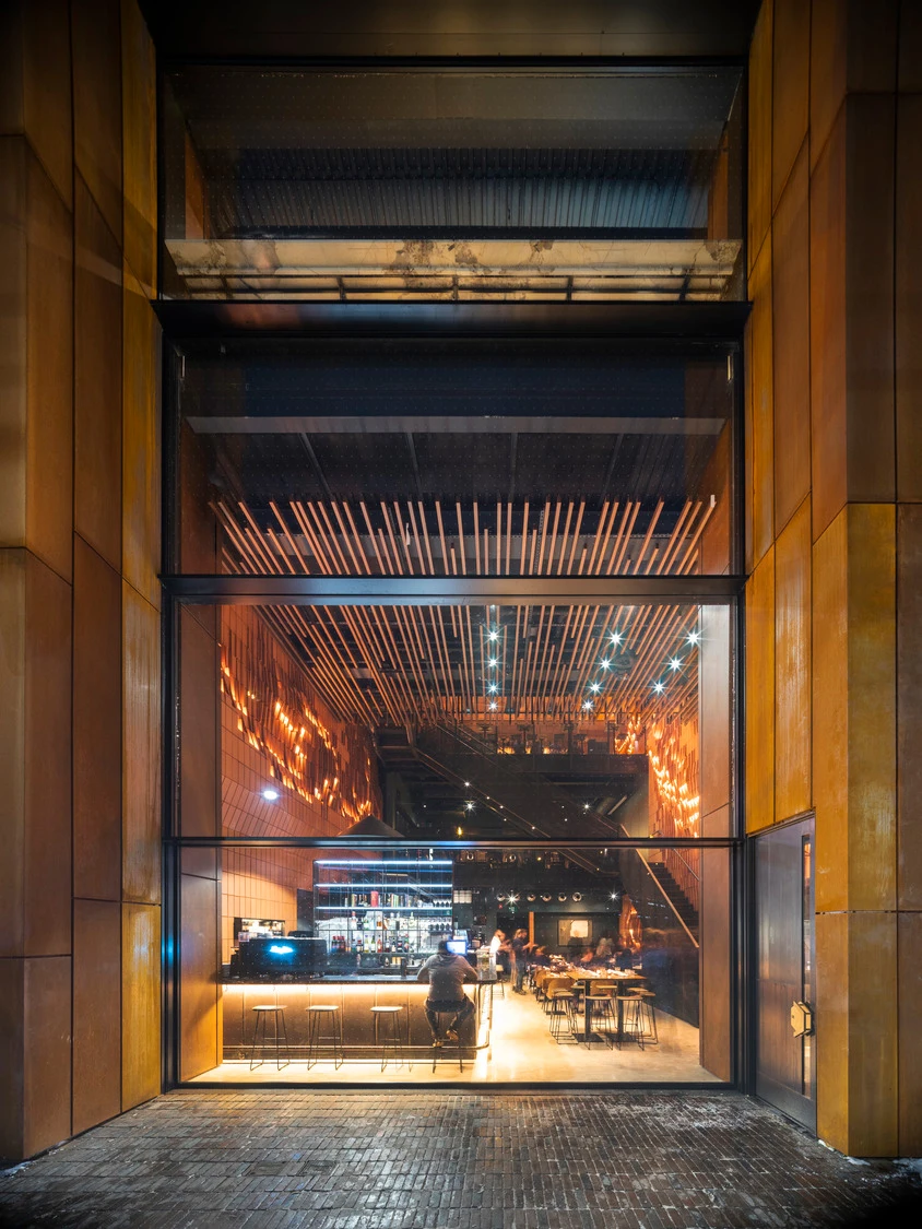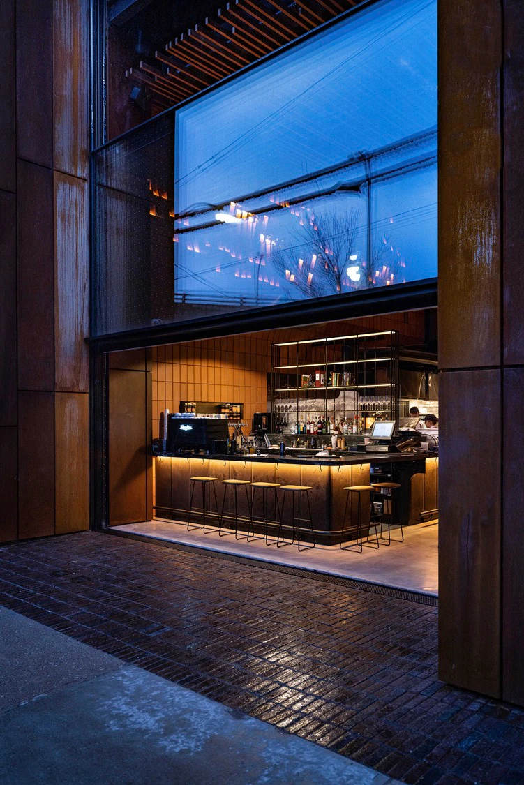 The varied interior experiences range from discrete dining areas to moody and dramatic spaces, some with their kitchen, a double-height cocktail bar under a big skylight, mezzanines, tasting rooms and a roof deck. The main façade is composed of a panoramah! massive vertical sliding window with five huge sashes (6x2.5m), weighing one ton each. While the upper two are fixed panes, the top and bottom panes of the lower three retract to the middle, opening the ground floor to the outside and creating natural ventilation to the top-level dining areas. This customized solution imposed several challenges given the limited space for pulleys and motors and the impossibility of having the crane in front of the building during installation due to the cars and tramway circulation in busy King Street East.