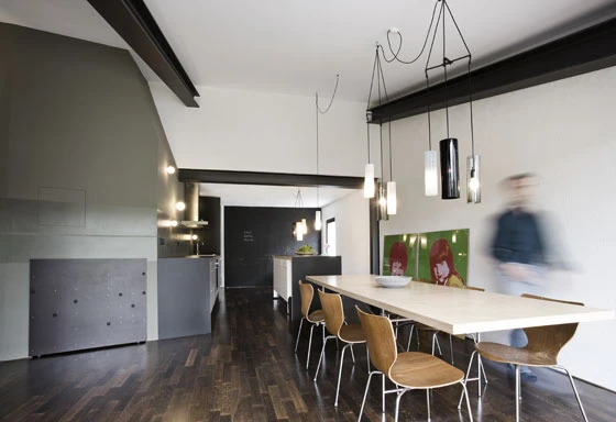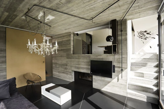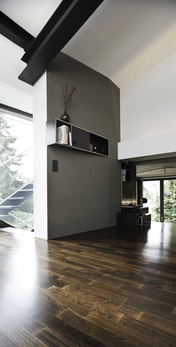 Die Erweiterung des Wohnraumes zusammen mit der Umstrukturierung des Bestandes verändert so das Bestandshaus vollständig. Im Innern rotieren die Ebenen um zentrale Kernstücke mit Kamin und Sanitärzellen, und schaffen so neue Zuordnungen der Familienmitglieder und Funktionszusammenhänge. Nischen und Vorsprünge erlauben neue Rituale und Aneignungen. Das ehemalige Raumgefüge des Einfamilienhauses schafft so fliessende Übergänge im Lebensraum von vier Generationen. In zwei Einheiten sind jeweils zwei Generationen zusammengefasst; Erdgeschoss bewohnen Urgrossmutter und Großmutter, Obergeschoss und Dachgeschoss werden zu Spiel- und Lebensraum mit Kindern. Angeschlossen an den Eingangsbereich ist das Büro des Vaters, grosszügig geöffnet zu Tiefhof und Garten.