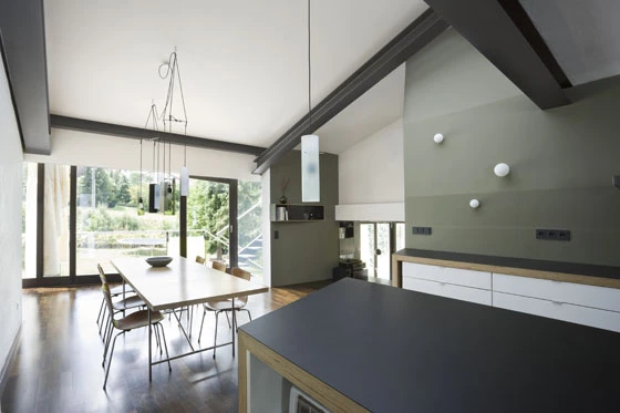 Damit unterstützt das Projekt das soziale Netz der (Groß-)Familie, es ermöglicht ein Miteinander und gewährt dennoch Rückzugsmöglichkeiten und Schlupfwinkel. Der Anbau verknüpft zugleich die räumliche Struktur von Bestand und Erweiterung und zeigt durch sein unabhängiges, leichtes und zugleich kraftvolles Erscheinungsbild eine neue Architektur in dem homogenen, eher traditionellen Umfeld.