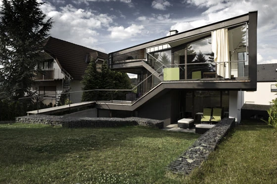 Der Anbau besteht im Wesentlichen aus zwei strukturellen Teilen, einem Sockel aus Stahlbeton, und einer leichten Haube. Diese sind verbunden durch ein Stahlband, das beide Teile zusammenfasst und sich als konstruktives Band an der Fassade abzeichnet. Das gefaltete Band der Rampenanlage und Treppen fügt sich in die Struktur des bestehenden Treppenhauses ein, und erweitert so die rückwärtigen Wohnräume durch ein Split-Level-System. Es verknüpft nicht nur die Innenräume untereinander, sondern schafft ebenso kontinuierlich Beziehungen zum Außenraum, jeweils anschließend an die einzelnen Geschosse und Absätze, vom Garten bis zur Dachterrasse.