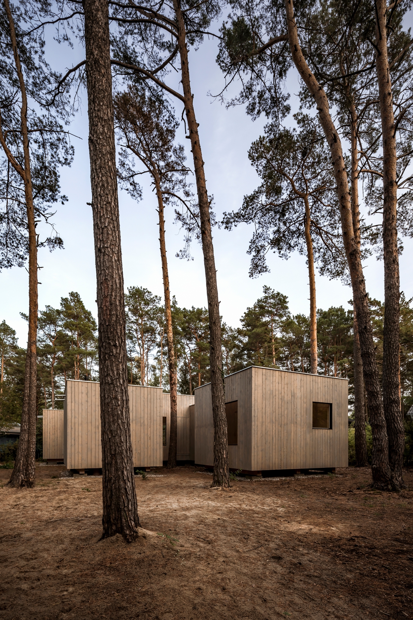 Haus Koeris is a private home that is situated among tall pine trees on a lot near a lake in close proximity to Berlin. As a structure entirely made of wood, the building is elevated from the ground to minimise the impact on the land and to avoid contact with the seasonally damp soil. The irregular shape of the house stems from the position of existing trees. Five boxes are arranged in a staggered layout with the individual rooms overlapping each other allowing for connections between them. The shifts in the floor plan create small patios and green niches along the building‘s perimeter. Some of these alcoves are sheltered from wind or hidden from views, others capture the sun and thus create pleasant microclimates. The recesses give the residents various opportunities to use the exterior as inhabitable open air spaces in dialogue with the internal rooms, proposing a new relationship with nature where indoors and outdoors blend into each other.