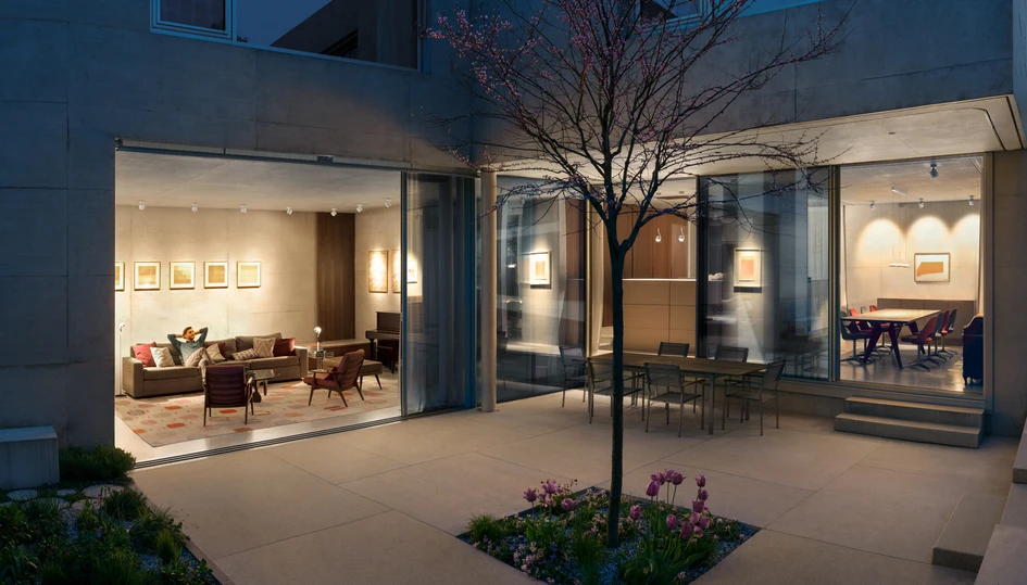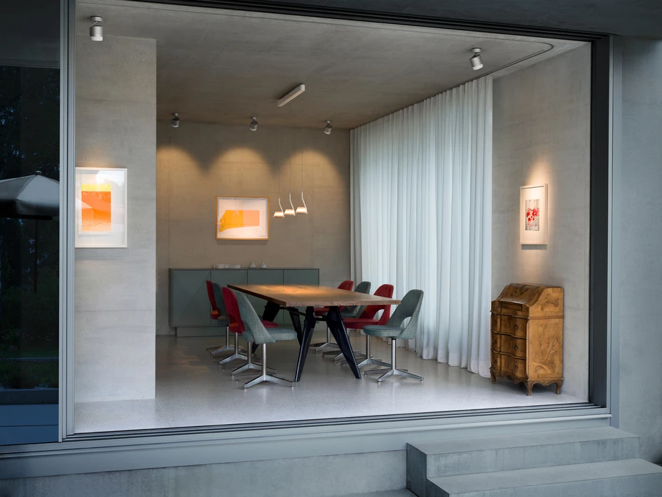 The ground floor of this urban exposed concrete house is characterized by flowing spaces separated into different rooms through shifts in floor level and wall elements. Architecture and space-defining extensions, textures and materials work in sync with one another to form a very dense atmosphere.