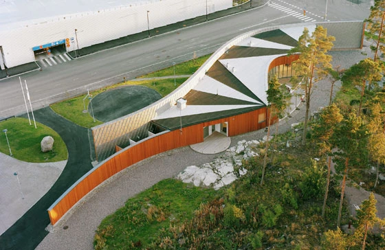 The plot for the projected Helsinki Seafarers´ Centre is situated by the main entrance to the Vuosaari harbour, on the northern corner of the area. In practice the building location is the only point in the whole harbour area that contains any natural forms and elements. As the only public building in the area, its role is to serve as a place of respite; a small multipurpose building for the seamen that arrive at the harbour form afar. The starting point in a David and Goliath juxtaposition has required a carefully considered architectural strategy. The infinitely small volume of the Seafarers’ Centre was in danger of being completely dominated by the crushing hectare-sized steel warehouses, and the artificial landscape of tarmac fields and container seas. As a counter-point, a soft organic form language was chosen for the building, as well as a wood construction. The architecture of the building could be described as contextual in the wide sense of the word: the preserved hillock, with its trees and rocks, is an essential part of the architecture of the building. The objective in the design of the building has been to create a unique identity, because in the best case scenario the distant traveller can take home a positive memory of something tantalizingly strange yet hospitable. The completely wooden structure and its compact shape are a homage to the building tradition based on the purposefulness of wooden ships and the aesthetics that spring form it, as well as a comment on the ecological challenges of the present. The premises offer both physical and spiritual nourishment: the spiritual word and composure, coffee, a laundry and computers. Particularly important are the cosy atmosphere and the simultaneous experience of familiarity and newness. The commissioners behind the project are the Finnish Seamen’s Mission and the Finnish Seamen’s Service, both of which have long traditions and an international history of supporting seafarers. The building has been consecrated as a church. The denominational aspect is brought out in a sensitive way, respectful of the religion and cultural background of each visitor.