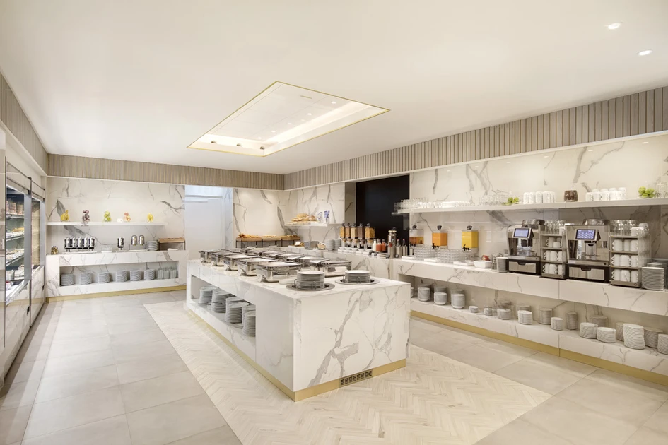 In the kitchen and common areas of the restaurant, the I Classici collection in Statuario color adorns the walls as well as the sides of the counters, worktops, and refrigerators. This timeless marble effect, used consistently across multiple elements within the space, imparts a touch of timeless elegance, creating a bright and welcoming environment. In the breakfast area, the same light tones, combined with wood, accompany guests in a relaxing chromatic-sensory experience, perfect for starting the day with serenity.
