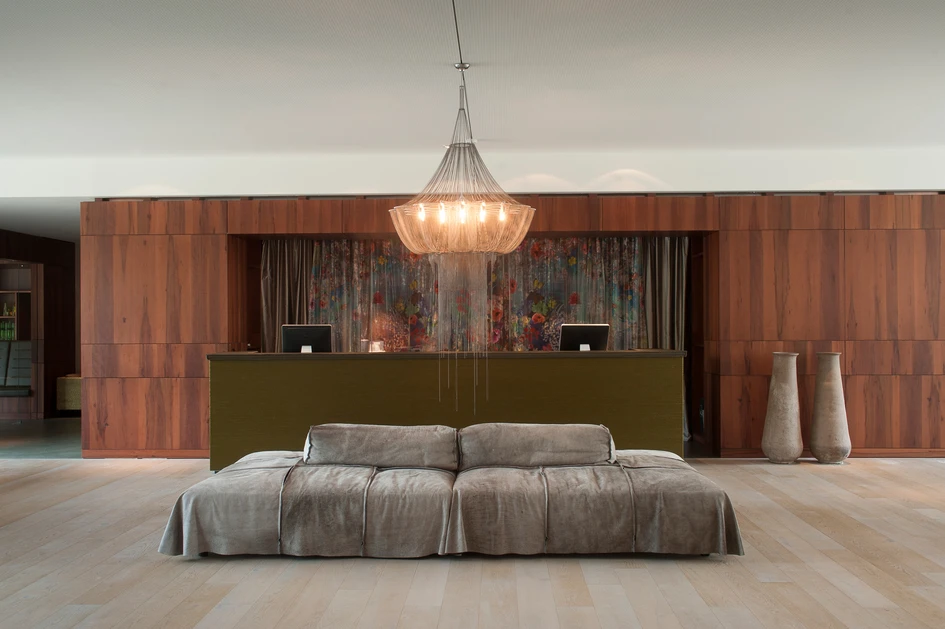 Empfangen wird der Gast an der lang gestreckten Rezeption, die mit ihrer strohgeflochtenen Oberfläche Bezug auf traditionsreiche, hier ansässige Manufakturen nimmt. Durch die dichte Reihung der grün schimmernden Strohbänder kommt eine ornamenthafte Struktur zu Stande, die auch typisch für eine thailändische Adaption und Transformation einfach zugänglicher Alltagsmaterialien steht. Gerahmt wird diese Theke durch einen raumgreifenden Körper in Apfelholz, der den Wellness Empfang, eine Bussiness Corner und ein rückwertiges Office Center elegant einbindet und Platz für 4 geschützte Arbeitsplätze bietet. Zwei kleinere, losgelöste Infotheken treiben als abstrahierte Bootskörper dem Gast entgegen. Dazwischen spannt sich eine grosszügige Lobby, die den Gast mit vielfältigen Aufenthaltsbereichen zum Verweilen einlädt. Der Boden schimmert in Seegrün und weckt in seinen Spiegelungen Erinnerungen an die Tiefe des nahen Wassers, über das ein silbern verwittertes Holzdeck auf die Terrasse führt. Dieser Blick nach Draussen, die offene Gebäudefuge zwischen Elements und Cocon setzt den Besucher immer wieder in Bezug zu dem grossartigen landschaftlichen Umfeld. Sie thematisiert dabei auch die Unterschiedlichkeit der Häuser und ist als geschützte Innenterasse nutzbar gemacht.