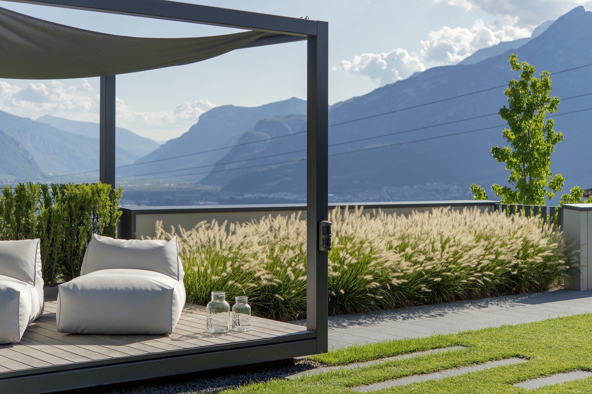 The design layout creates oblique surfaces parallel to the line of the home’s development, where the succession of materials highlights the strong relationship with the perspective views from inside. The windows overlook the garden, framing corners of relaxation on perfect display under the sunlight. The home’s southern exposure creates original plays on light and shade, where clear decorative tones form a pleasant contrast with the darker colours of the structural elements. A long pergola made from graphite-coated aluminium elements hosts a relaxation area facing the home’s living area. The entire body is raised with respect to the large grass area and protected by technical curtains.
