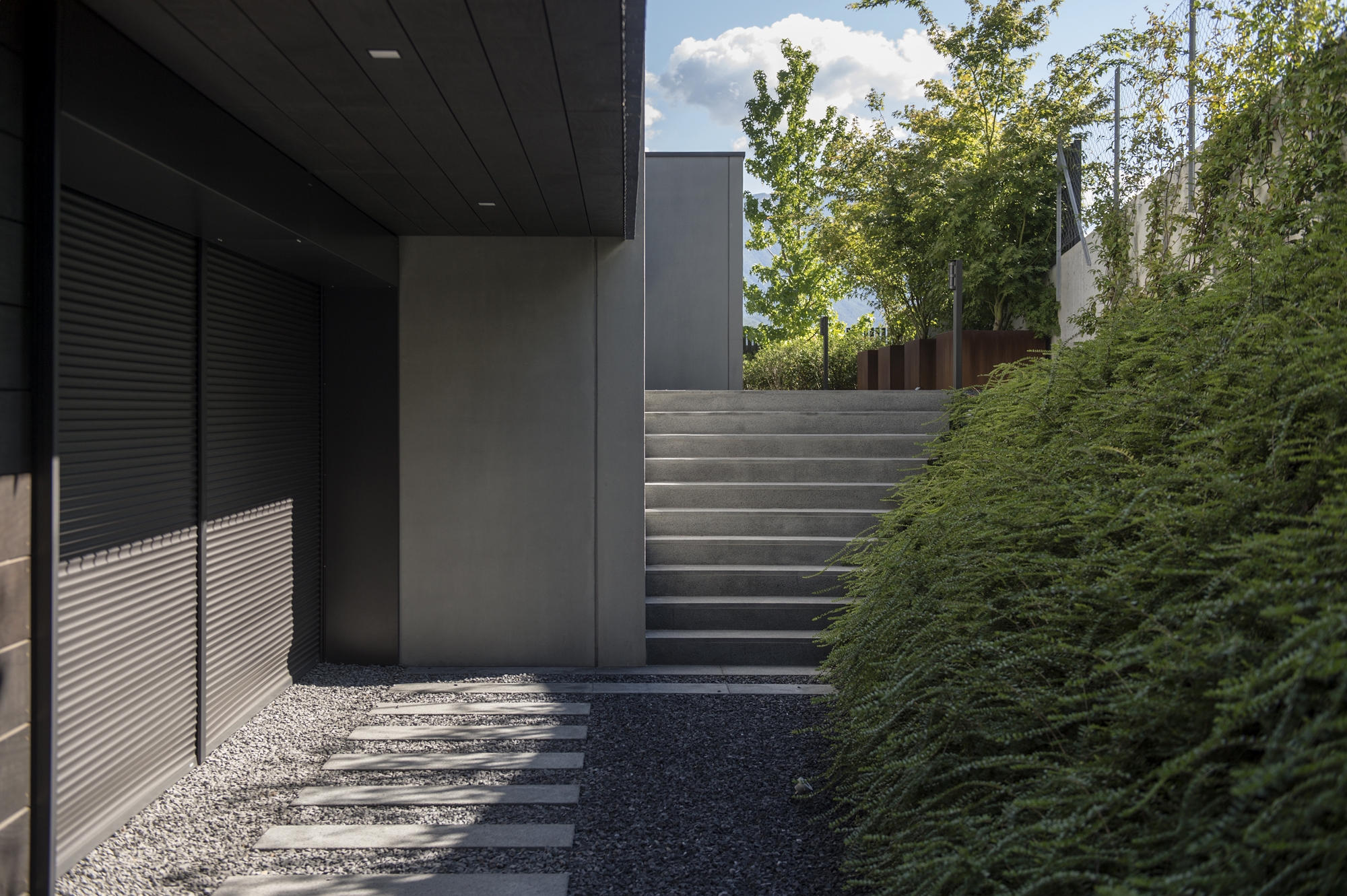 The formal yet cosy architecture of a villa facing the Dolomiti mountains, embrace a garden that offers a touch of privacy while embellishing the natural scenery. The strongly recognisable signature style is rigorous yet at the same time natural; the design layout follows the building’s contours while accommodating the soft and wild forms of the carefully selected plants. Guests are welcomed by a small forest of holly and swamp spanish oaks as soon as they step foot through the gate, as they are left to ponder on the home’s large and striking windows. A piece of landscape becomes a domestic setting, screening the view of the surrounding homes and shading a sun deck in ipe wood decking.
