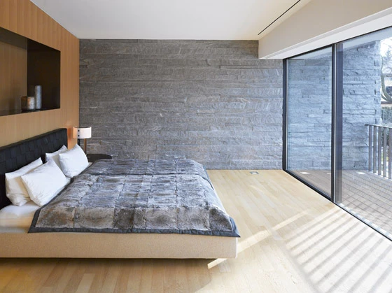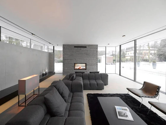 Die Besonderheit des Grundstücks liegt in seinem Nordhang, der über zwei Geschosse überwunden werden muss, um die annähernd plane Gartenebene zu erreichen. Daraus entsteht das Leitmotiv eines „sich den Hang hochwindenden Hauses“ mit einer Bruchsteinfassade, die im Zusammenspiel mit den ultrafeinen Fensterprofilen eine Dialektik „schwer-leicht“ thematisiert. Die Organisation des Hauses ist trotz der komplexen Geometrie in klar ablesbare Zonen eingeteilt, die zunächst auf additiven Grundmodulen von 7,80 auf 7,80 Metern basieren.