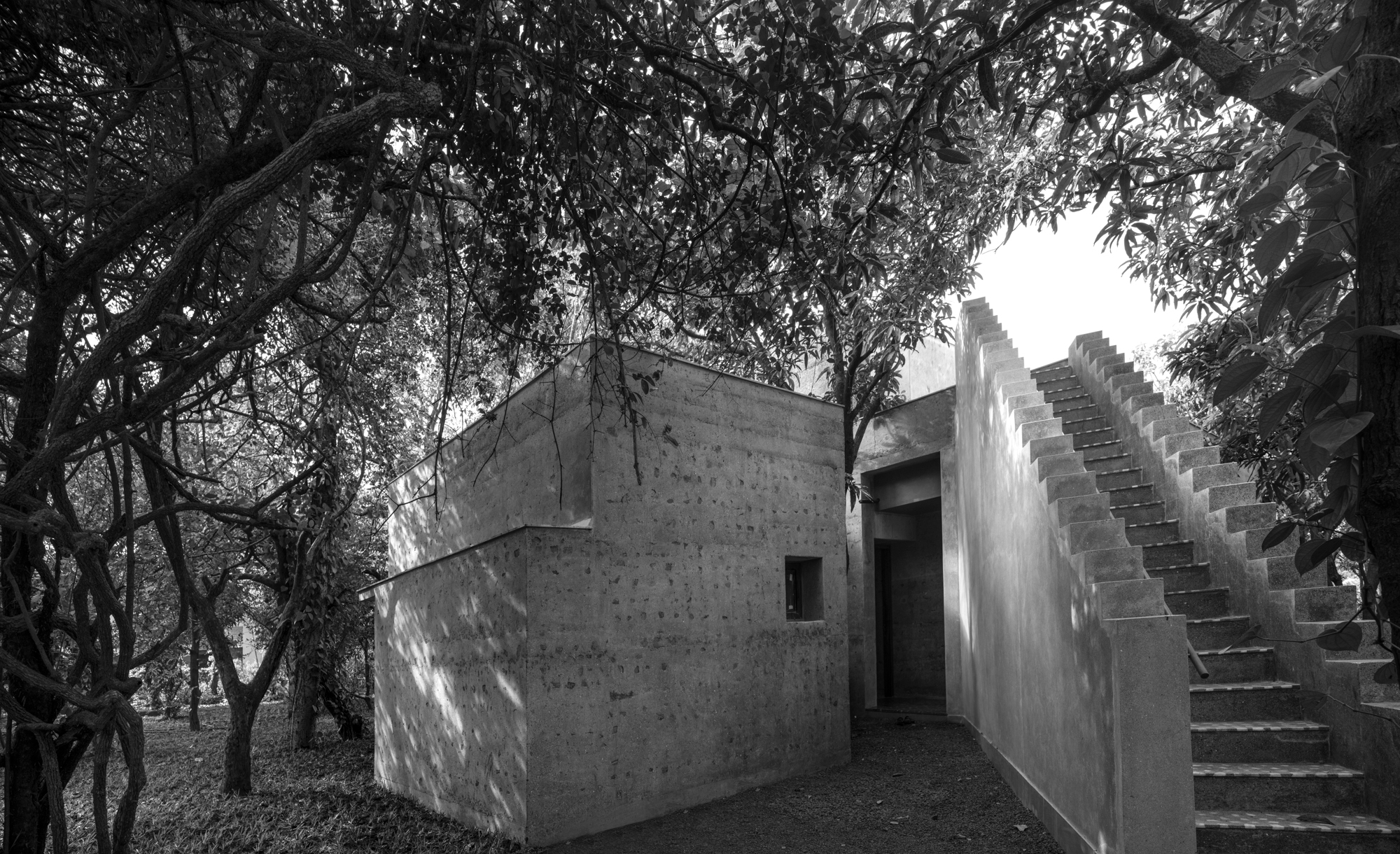 The House of Concrete Experiments is a residential project, located in the coastal town of Alibaug, near Mumbai. Set on the foothills of Deotalai in Zirad, the house is amidst a mango orchard.
