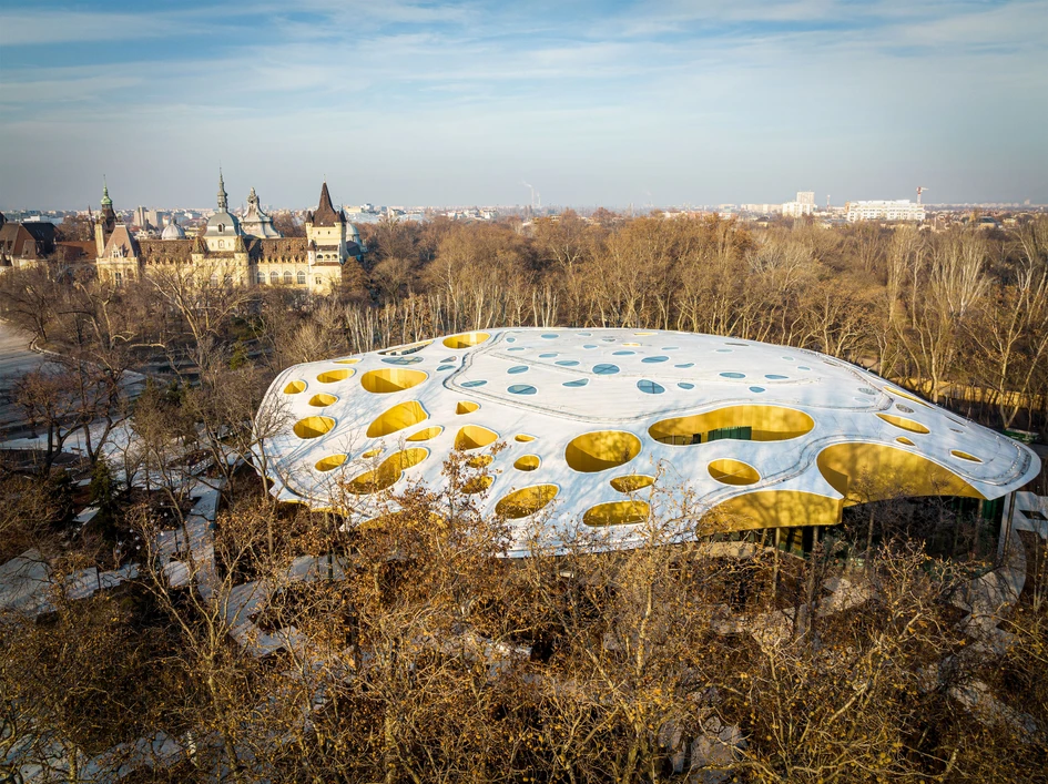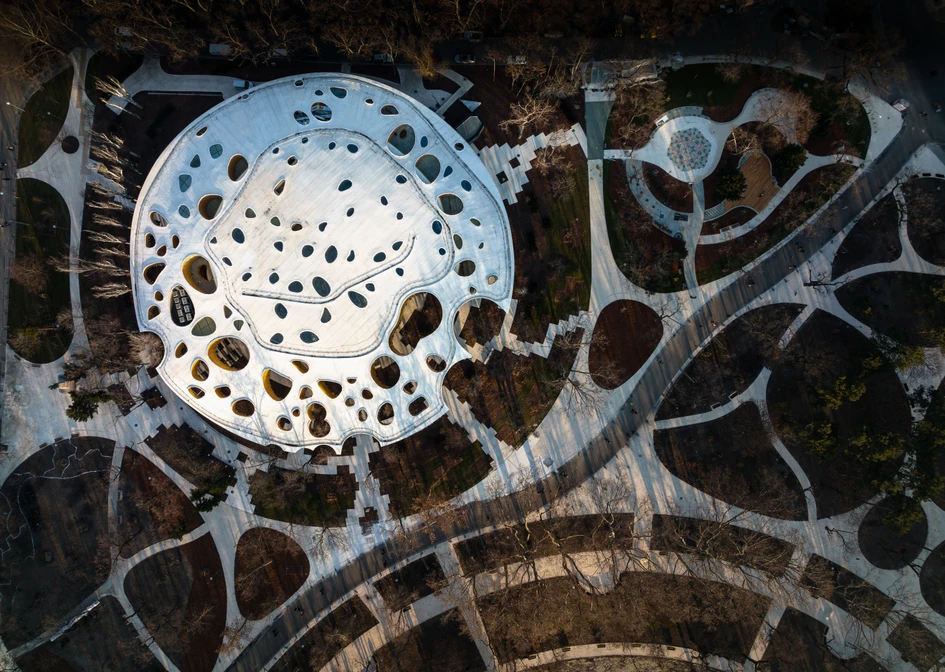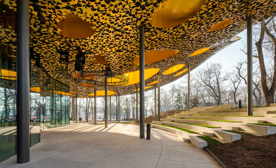 The feeling of being in nature is further enhanced by a canopy of over 30,000 decorative tree leaves set in the suspended ceiling and secured in place by a steel structure made out of 1,000 honeycomb-shaped elements. The building's unique roof structure is also inspired by the varying form of sound waves. The vast undulating roof structure changes depth and remains below the City Park’s foliage. The roof has been designed with nearly 100 unique, crater-like holes in the surface, which allow the trees to slip through whilst channelling light into the depths of the building, lighting the interiors and creating a special atmosphere, as if visitors are walking under the trees.