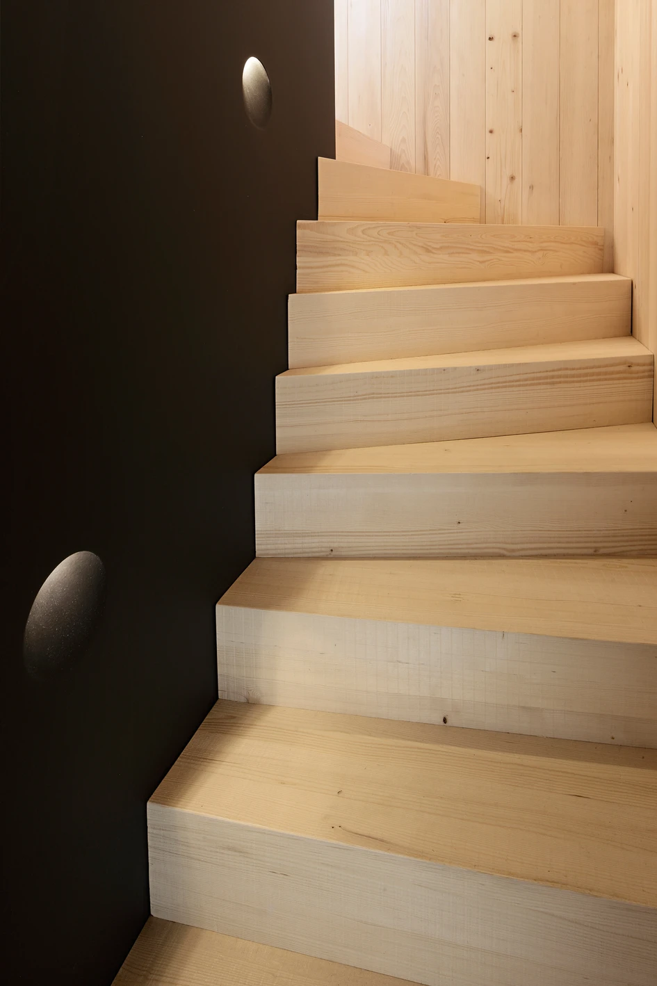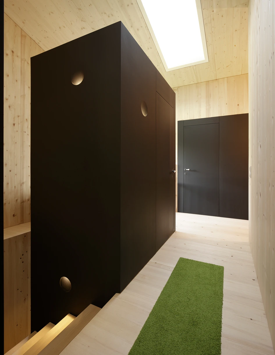 The entire interior panelling is made of wood boards 3cm thick and just planed from the local forest. In combination with the clay walls in the sleeping rooms, there is a high-quality natural living climate, which can absorbe the humidity and feed the living space back on with humidity.