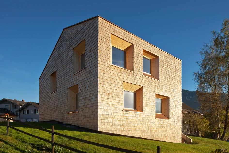 The house gets a locally typical shuttering of wood shingles as a new skin.