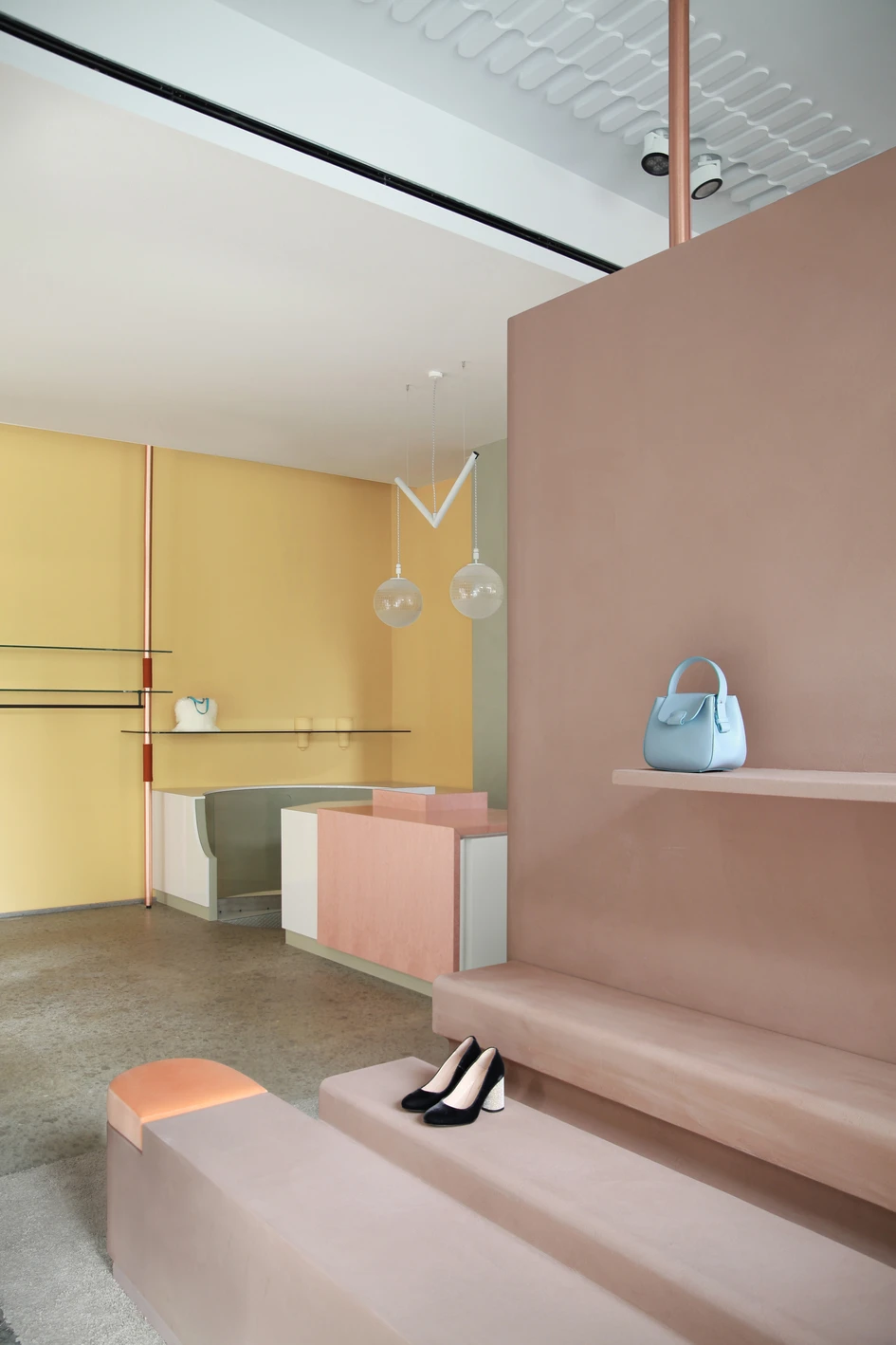 The shop is divided by an angular wooden screen that has been plastered in clay, which articulates the different display areas and also becomes a display in itself (both for the windows and for the shop’s interior), on which shoes, bags and accessories can be placed. Another small architectural element, also rendered in clay, contains the changing rooms.