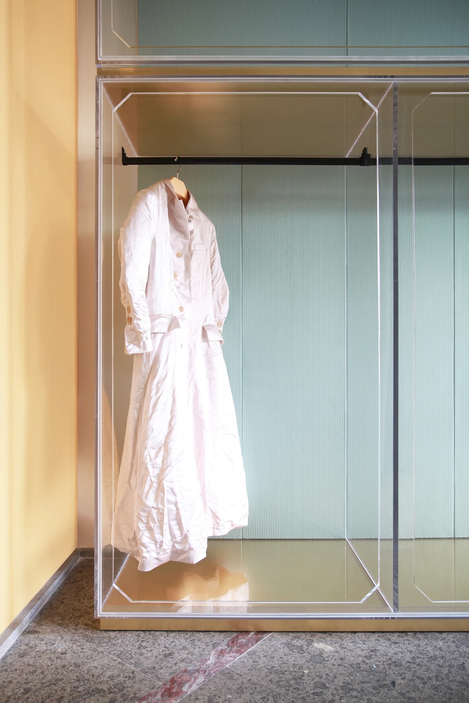 The large acrylic plexiglass system of cupboards and the made-to-measure lighting fixtures give the suggestion of the domestic dimension that represents the medium between the product and its audience.