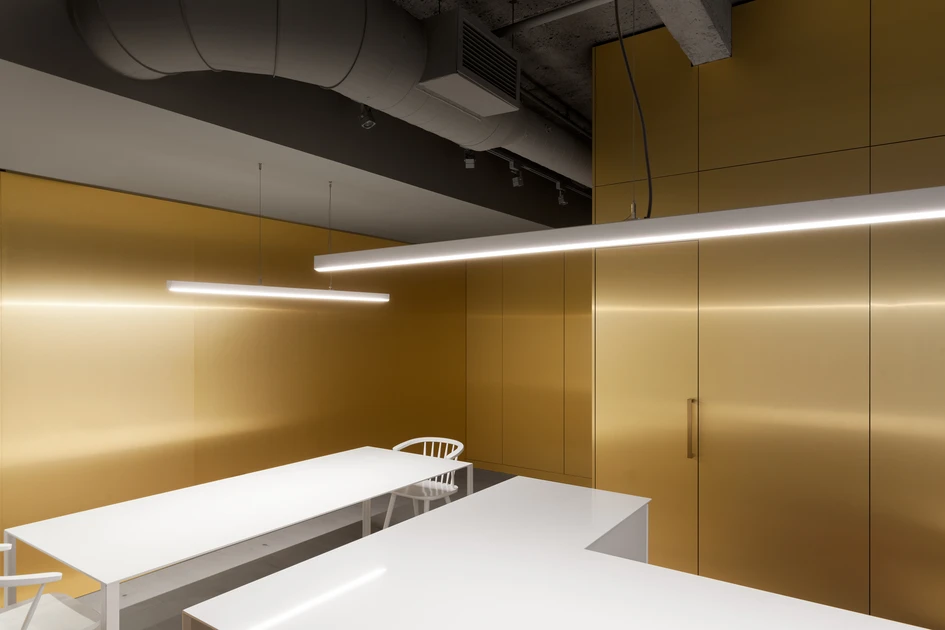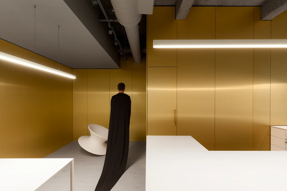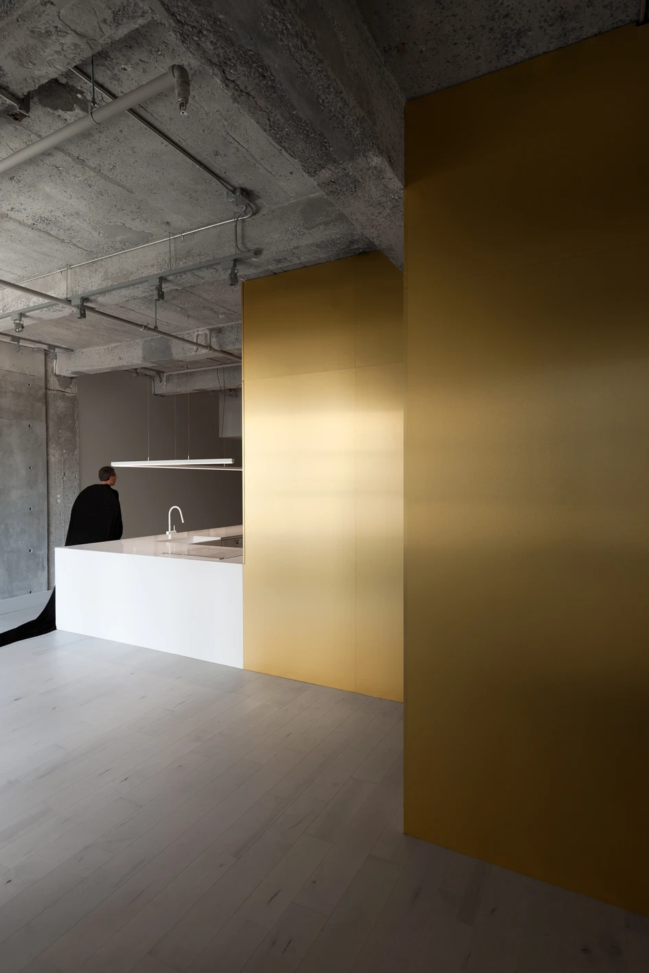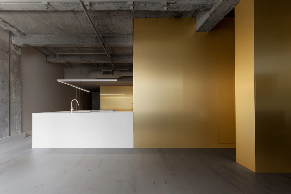 The gray tones of the raw materials unite into a volumetric entity pierced by an immense golden structure deploying to abolish the hierarchy of spaces. Offering images evolving towards abstraction, this golden ribbon, containing domestic functions as storage units, breaks up space into a single operation of powerful efficiency. The diffusion of a felted and enveloping light invests the place of a mysterious aura that contributes to its theatricality.
