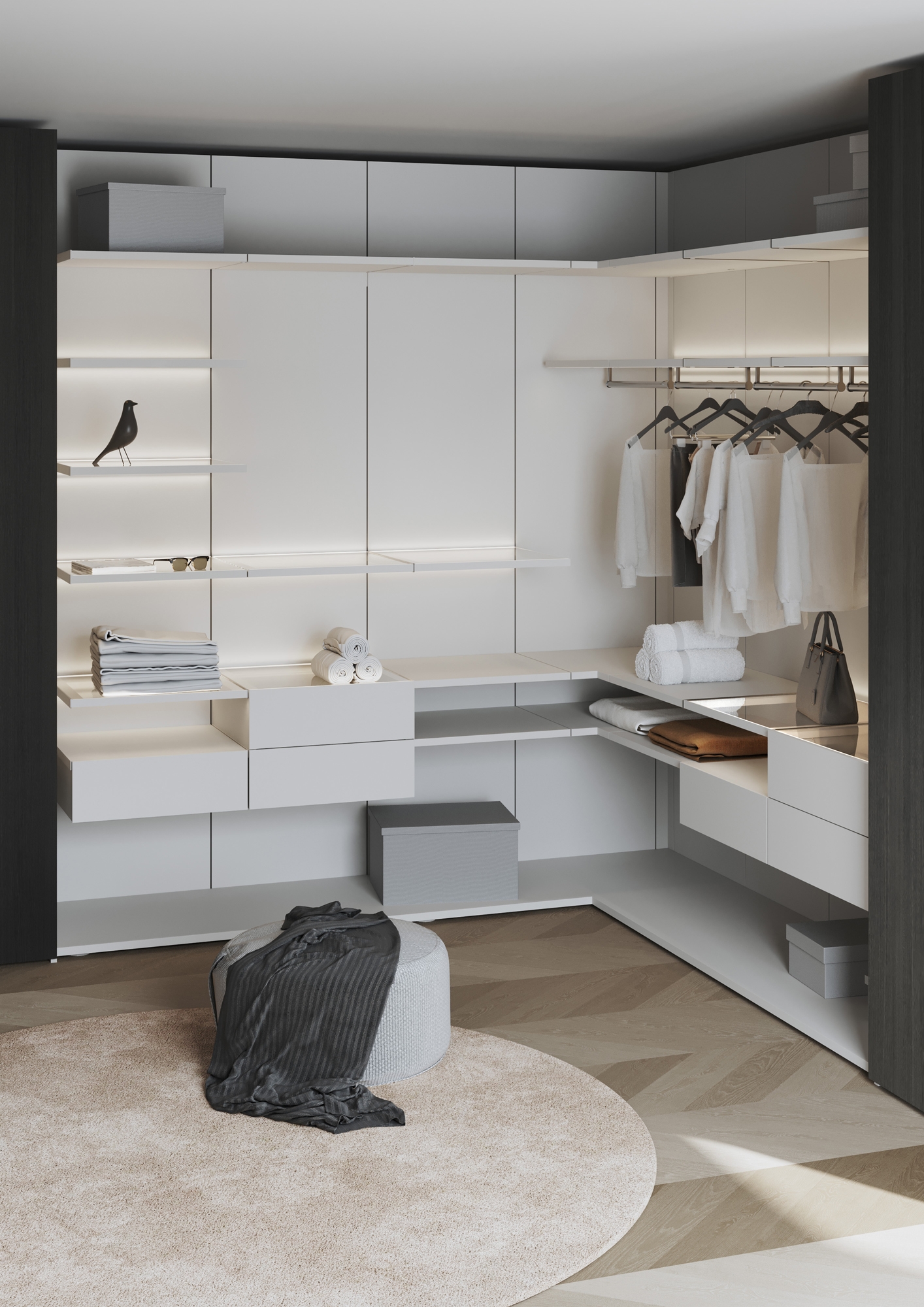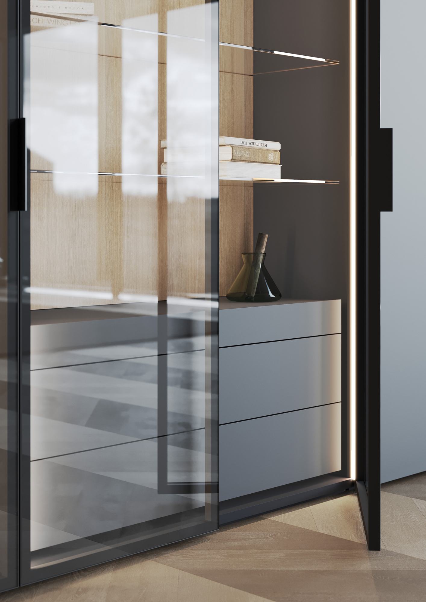 The latter is not only defined by colors and materials, but also results from the respective individual configuration of the cabinets. Open elements, lighting of various kinds and division of doors and interiors according to one's own taste allow for quite different effects. We had, we must admit, a lot of fun with the collect plus cabinet model. Timeless, innovative and full of clarity - this is the concept behind collect plus. The cabinets are individually fitted and made to measure, so in a sense our CGI artists had a free hand in designing the product images.