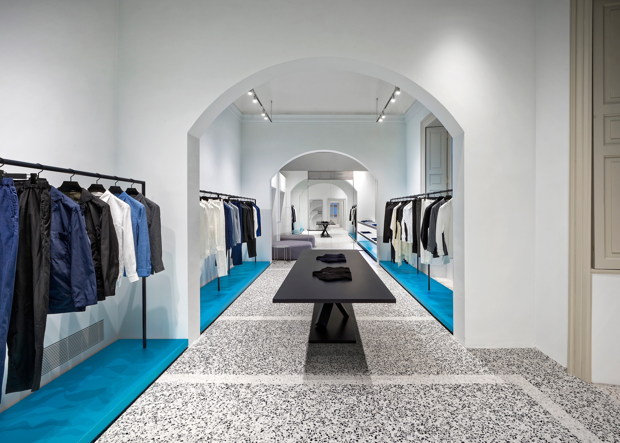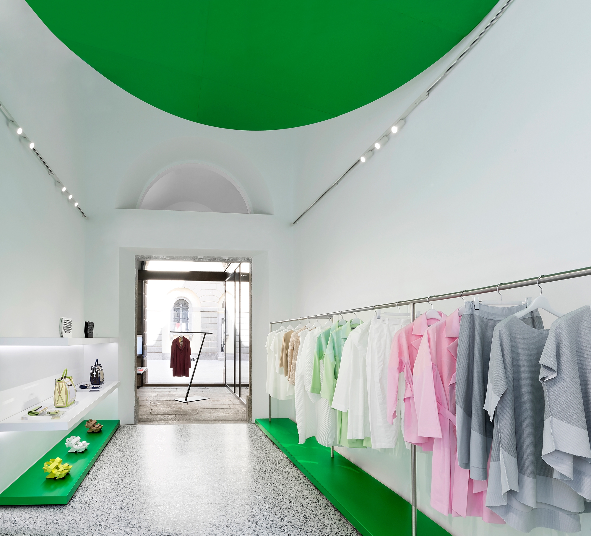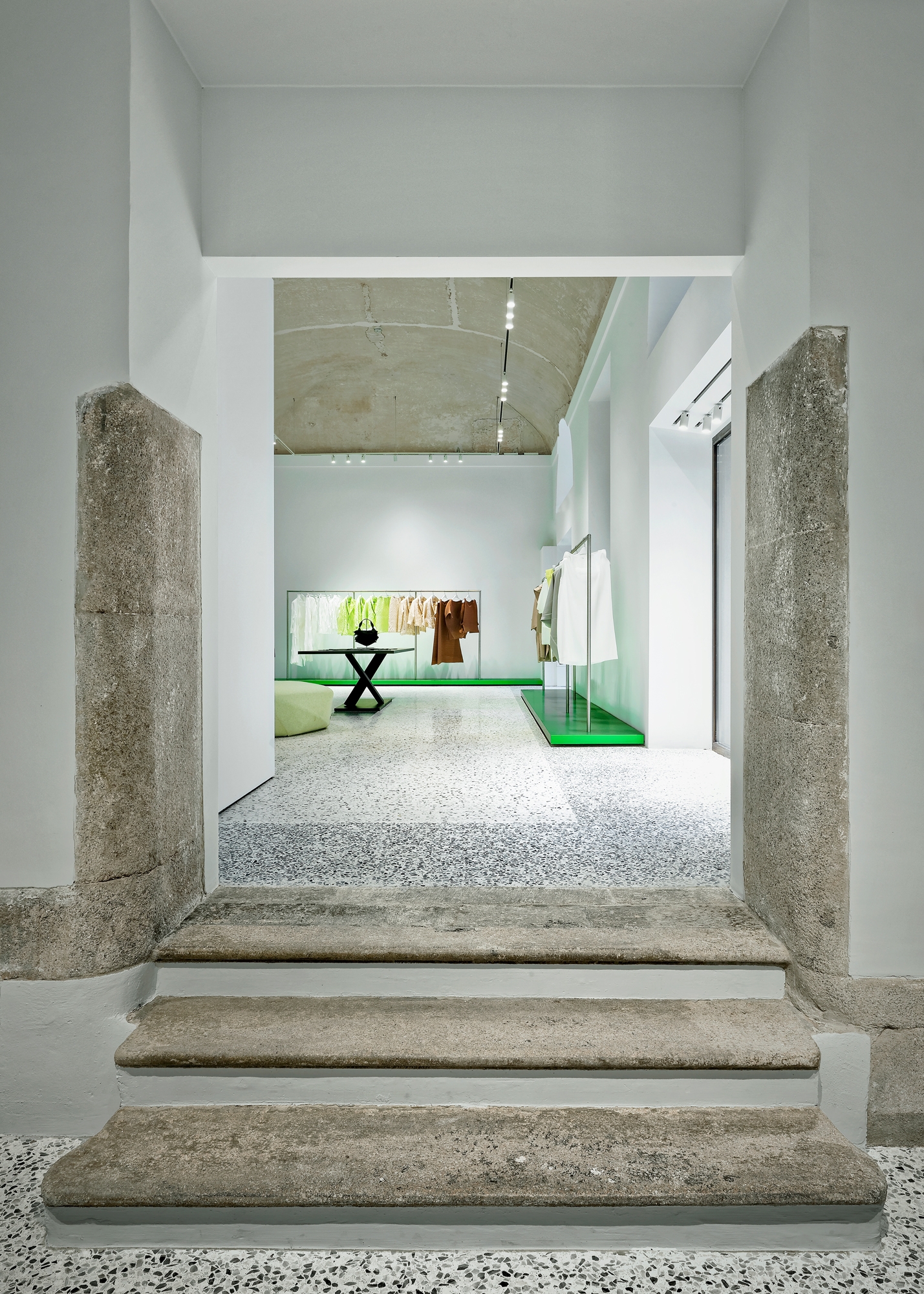 We are attracted to a past enriched by layers of history as well as an opaque future not yet realized. The space exists within a 19th century building located near Via Montenapoleone, Milan's sophisticated street famous for historical architecture. It expresses the contrast between history and future showing the many layers of time in the texture of the interior walls juxtaposed with futuristic colored aluminum.