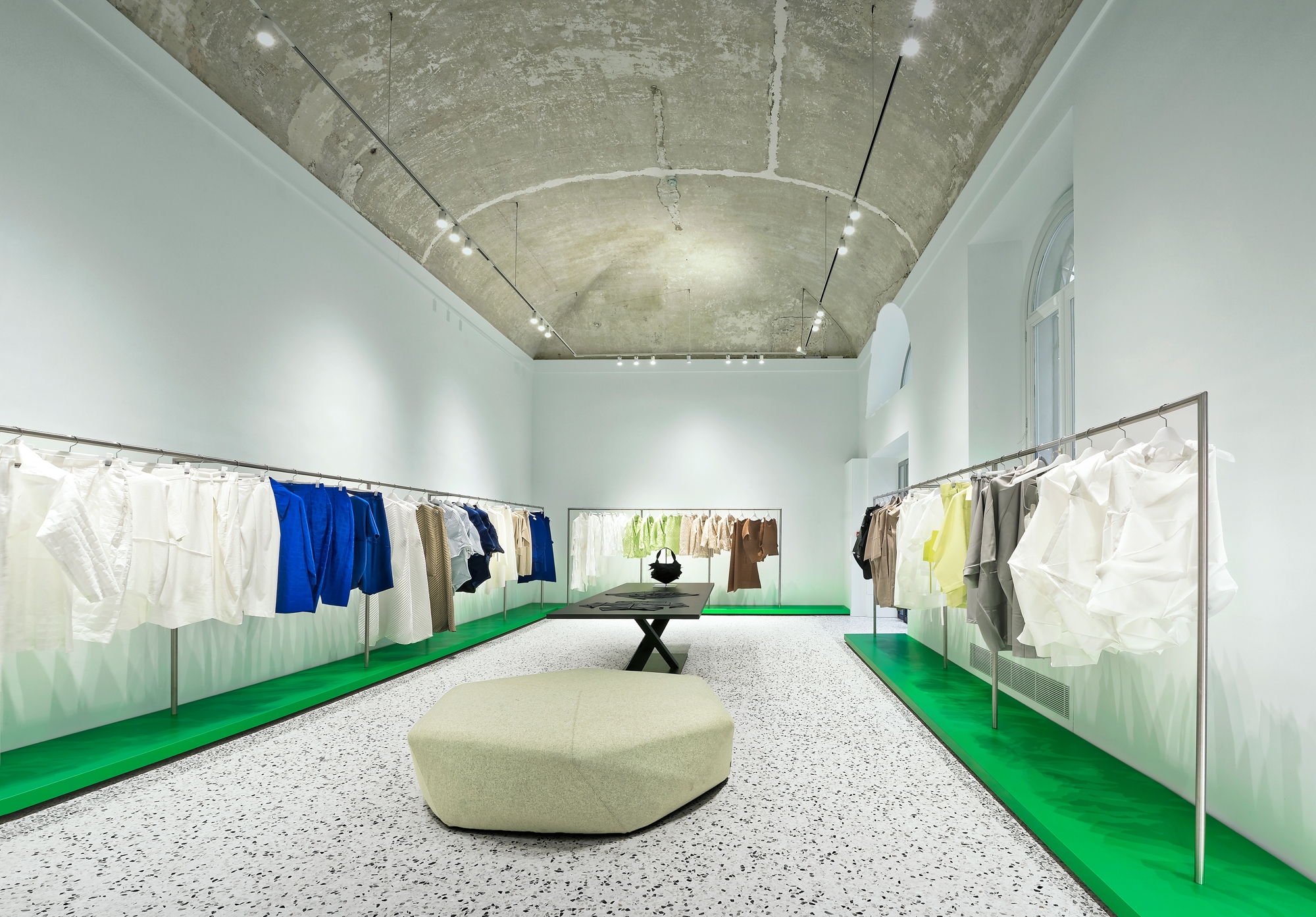 The floating sculptures of round aluminium are colored like pieces of dyed cloth. The blue, orange and green symbolize the energy of nature, and also delivers a sense of translucency. The essence of design harmonized with technology and handwork is projected into the shop space, reflecting the philosophy of Issey Miyake's creations.