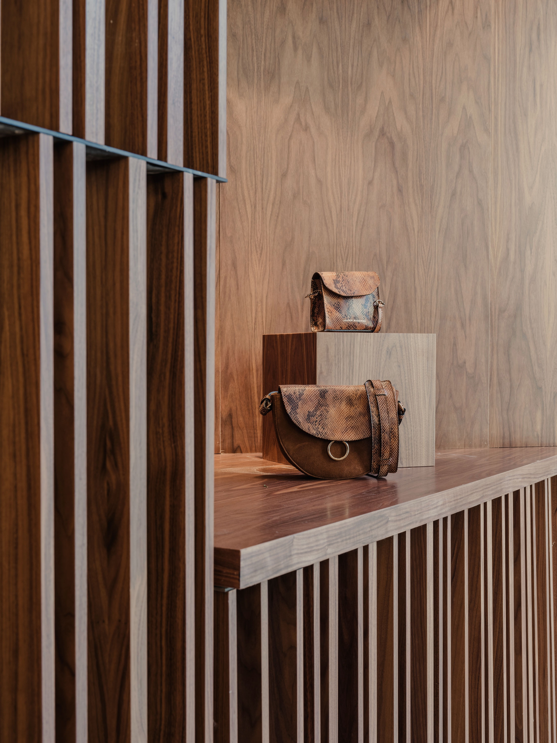 We used limestone, similar to Casa Mila’s curved facade material, and black iron for all store finishings made out of metal. These referenced to Casa Mila´s balconies, innovative in their function as a spine across the entire Gaudí building, and, when combined with the Javier Simorra walnut, create a symbiosis between two very distinct materials.