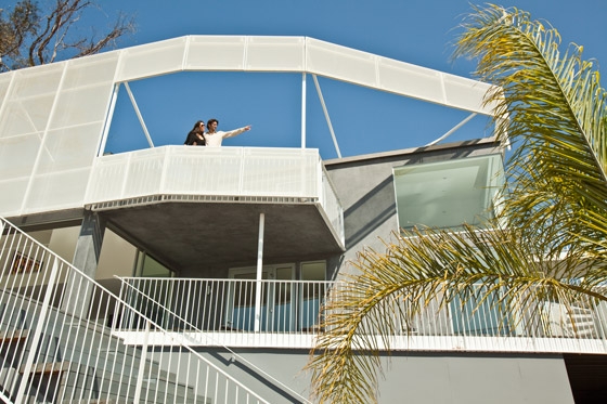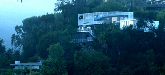 Sitting on an aggressively sloping site in the Crestwood Hills neighborhood of Los Angeles, the Jovanovic Residence combines a progressive and sustainable solution to an existing structure and addition. Through the utilization of a continuous foil wrap, various program elements including; a new guest suite, significant modifications to the master bedroom, exterior decking, and exterior facade, are synthesized together with a singular cohesive element. Usually used to shade vegetation and outdoor space from insects and bugs, this PVC coated polyester woven yarn was re-formulated to sustainably and programmatically cast a new identity and energy on the house. Separated from the existing stucco finish, the durable skin protects the house from solar abuse and heat gain. In addition, rather than following the form directly, the skin reduces the geometries of the existing house to simplified, planar shapes. The resultant forms create a powerful dialogue between existing and new space. At times privacy screening / guardrail / shading device, the skin embraces the house to create new found relationships between indoor and outdoor and public and private.