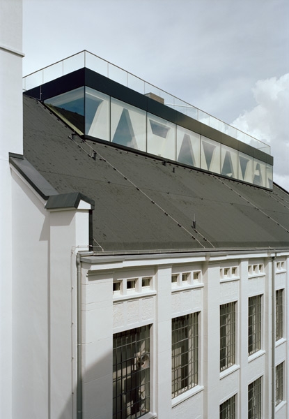 The vertical organisation between the first and second floors is expressed with the breaking up of the slab in correspondence with the entrance that gives the visitor a glimpse of the whole exhibition route. On the third floor, which is 12 metres high, a block has been inserted that forms a fourth floor and a staircase that leads to the terrace, crowned by the glass box. The Stoschek collection is mostly made up of videos that the client has chosen to present to the public with themed exhibitions that change each year. The public exhibition spaces on the first and second floors have therefore been flexibly organised around the constants determined by the horizontal and vertical circulation. Visitors’ movements constitute the generating element for the layout of the exhibition spaces. Sound and silence alternate along the exhibition route; areas for watching videos are enclosed by soundproof walls while the soundless spaces in between create a break between one piece and another so that each can be fully appreciated. The exhibition space is built on the relationship between the visitor and the work, on the relationship between one piece and another. The 12-metre-high third/fourth floor is Julia Stoschek’s home and also a space for special events. This open-plan floor occupies the factory’s entire roof space, where structural elements have been left exposed. Inside, a kitchen is enclosed in a cube and the bedrooms and bathrooms in a vertical parallelepiped. Around these two elements the house becomes a large exhibition space, where pieces of furniture and works of art come together to create a complete installation.