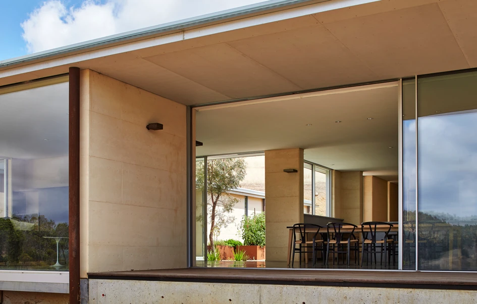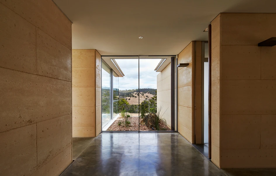 The courtyard garden in raised corten beds is productive; producing fruit, herbs and vegetables. An essential element especially when in an isolated location. Rammed earth walls huge thermal mass ameliorate temperature fluctuations over the seasons.