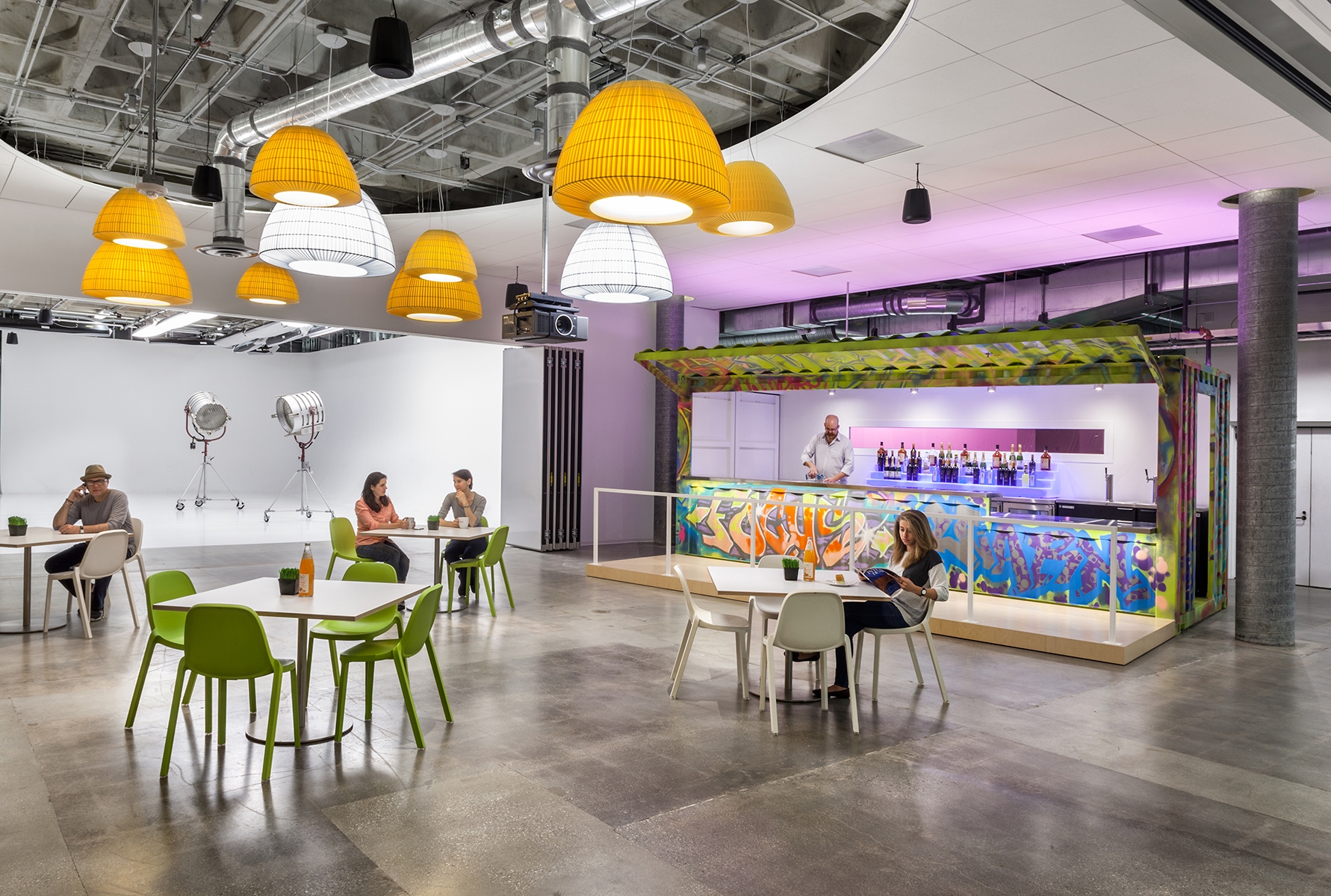 Gathering spaces at the front and rear of the building allow the company to host public relations events onsite with maximum exposure to the product. The event spaces include large display areas that showcase JustFab's products. The space also includes a full‐service kitchen & café with both indoor and outdoor seating to give employees a chance to relax and host lunch meetings without leaving the office. Shipping containers painted by a legendary graffiti artist who is also a JustFab design collaborator, were repurposed as a café bar and banquet seating. A bleacher stair creates seating for town hall meetings.