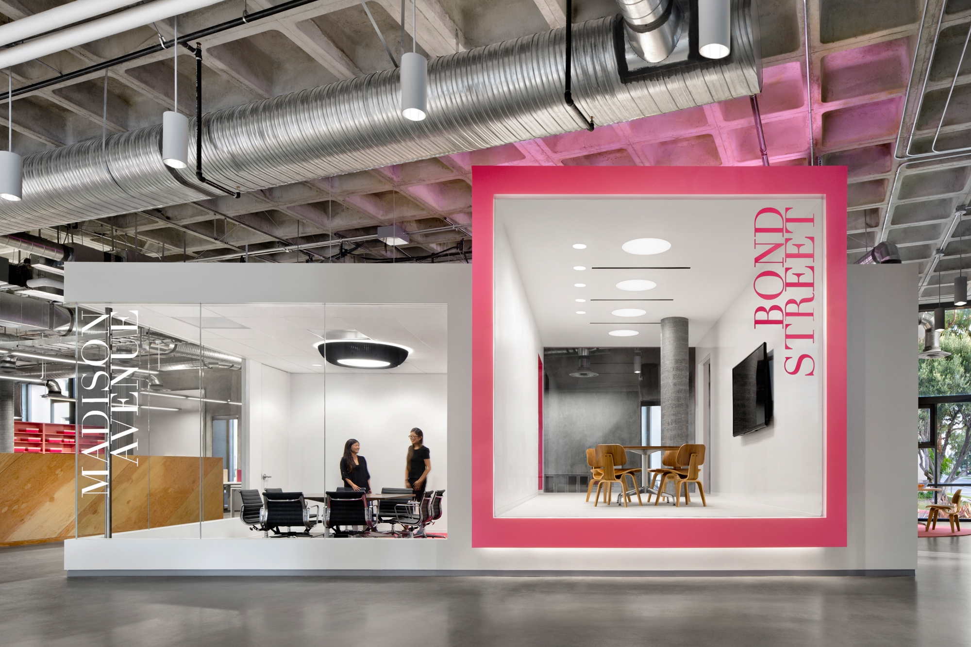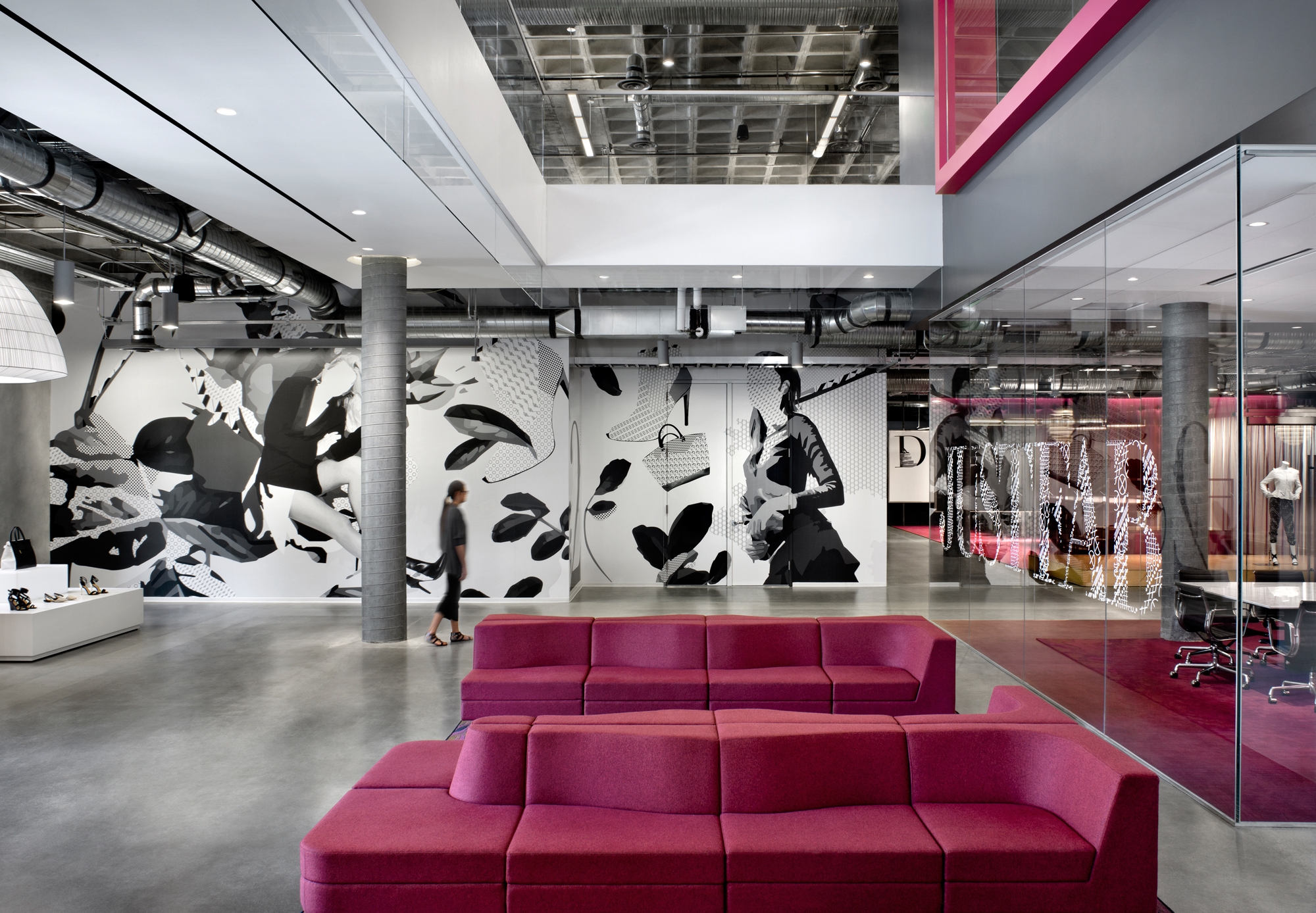 JustFab Inc.’s corporate color pink and the company’s strongly feminine brand were celebrated throughout. The interior & graphics designers worked closely to develop custom wall graphics, signage and carpet that reflect the brand. Taking our inspiration from clothing patterns & stitching styles the wall graphics became collage illustrations and plywood paneling matching a bias cut create beautiful textured pattern. Beyond planning principals the startup culture of the company was also captured by embracing the industrial elements of the building leaving them raw and exposed. The result is a sophisticated impactful and highly efficient creative community that is JustFab.