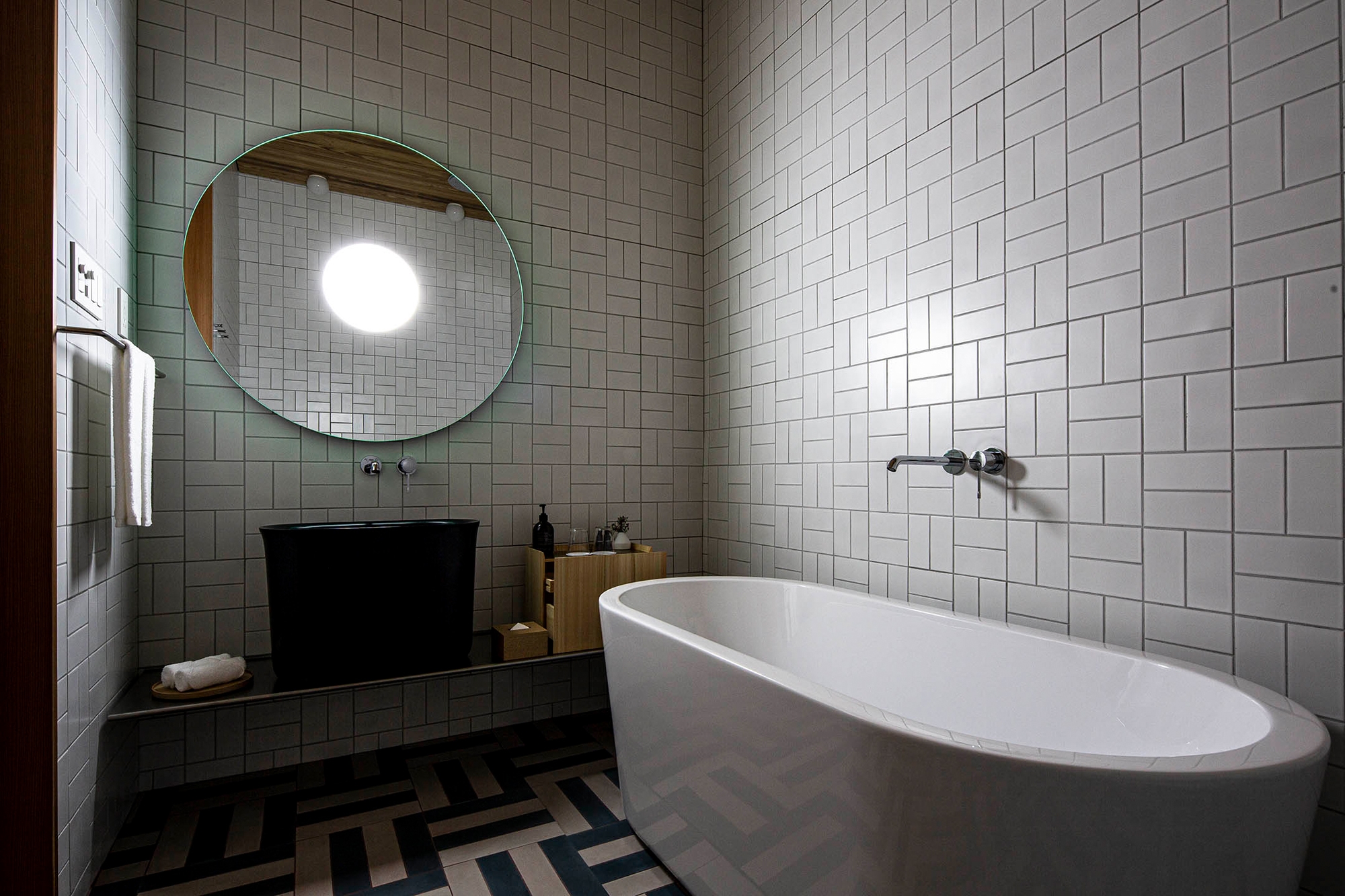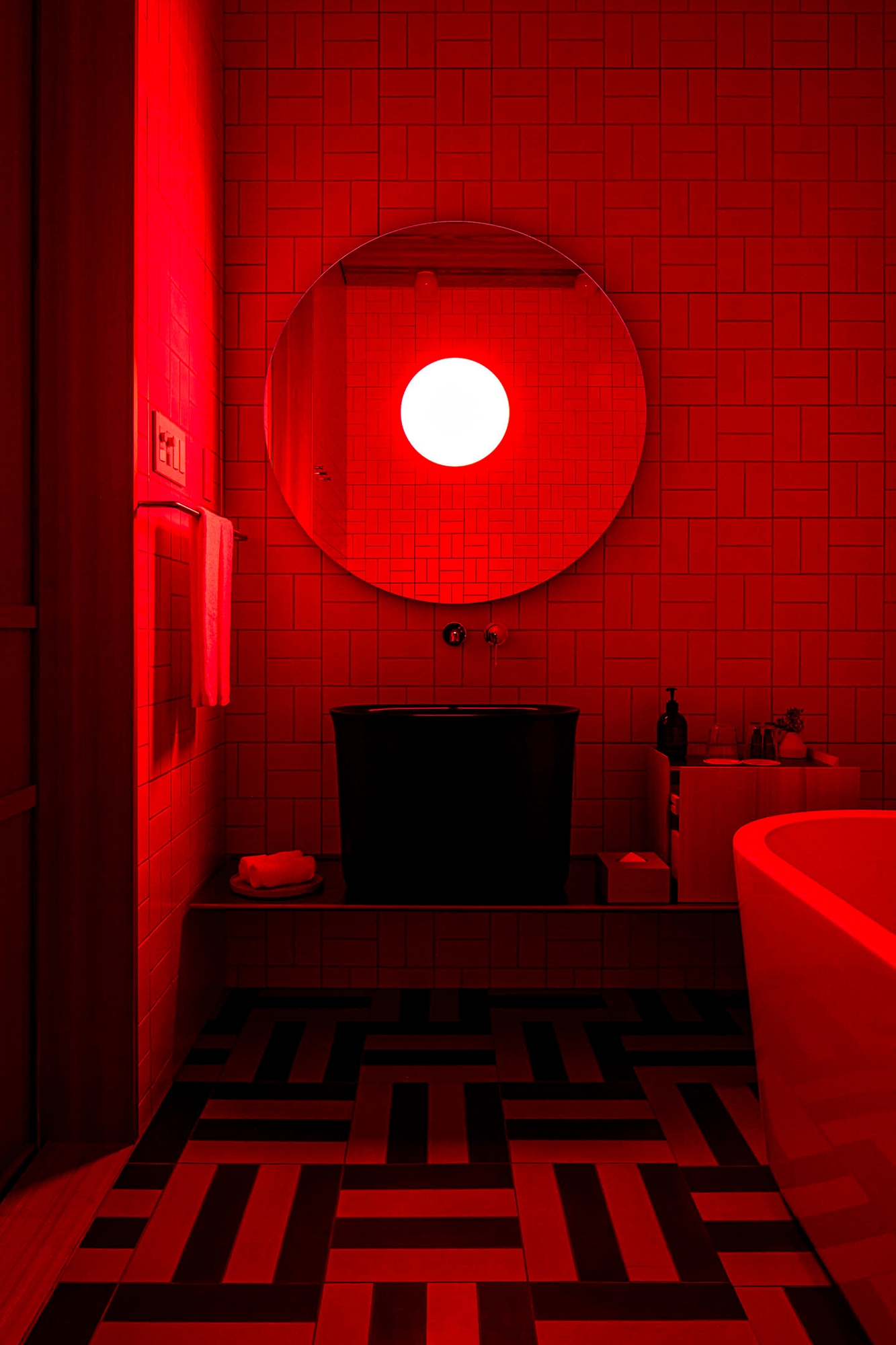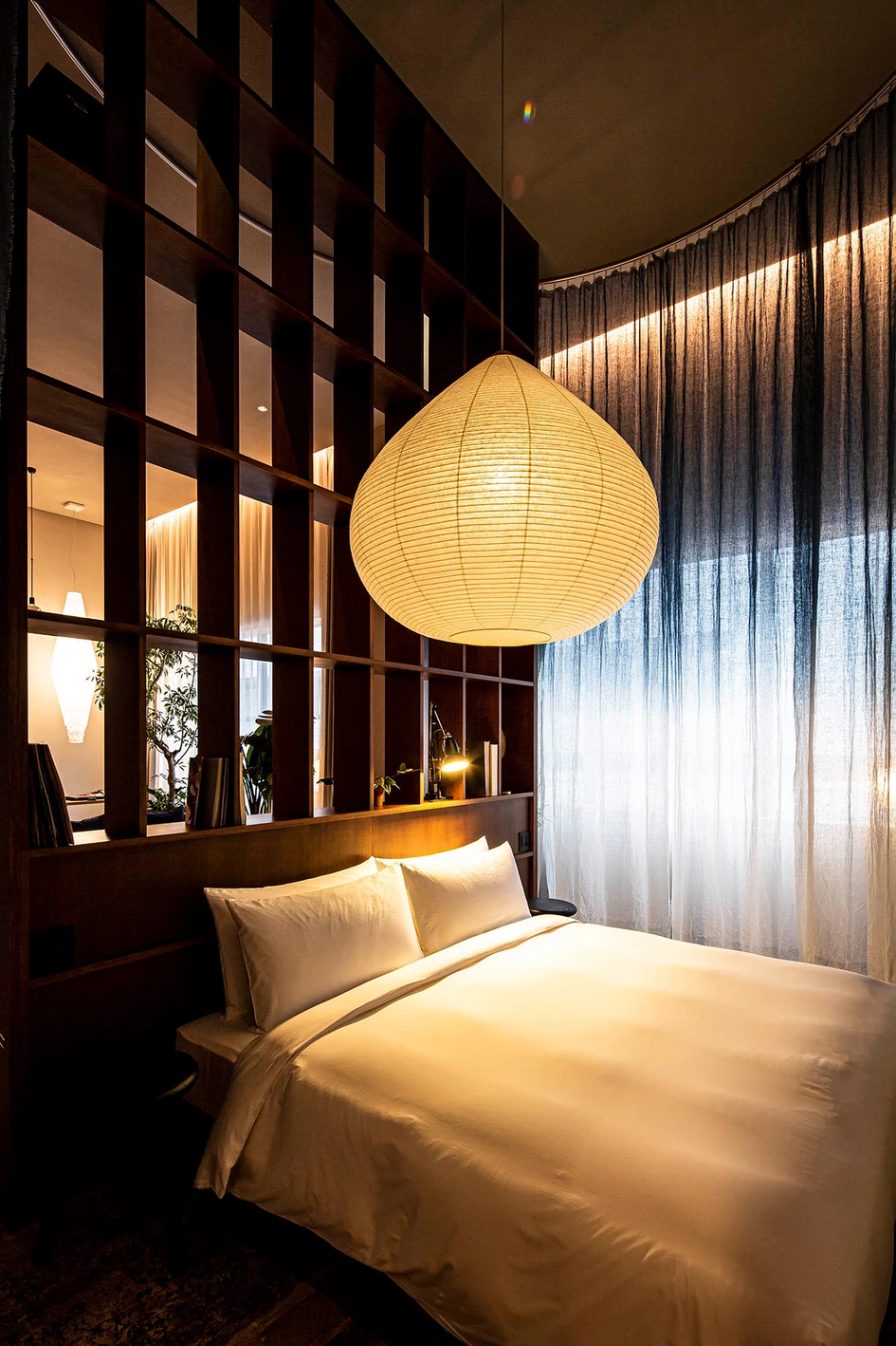 For each of the 20 guest rooms, which range from 20 to 80 square meters, we created sofas and recliners inspired by Japanese elements such as bamboo and origami, and we furnished the rooms with pendant lighting that offers a modern take on traditional lanterns. We also fitted the washrooms with circle mirrors that can be used to set the scene by changing the color of the lighting.