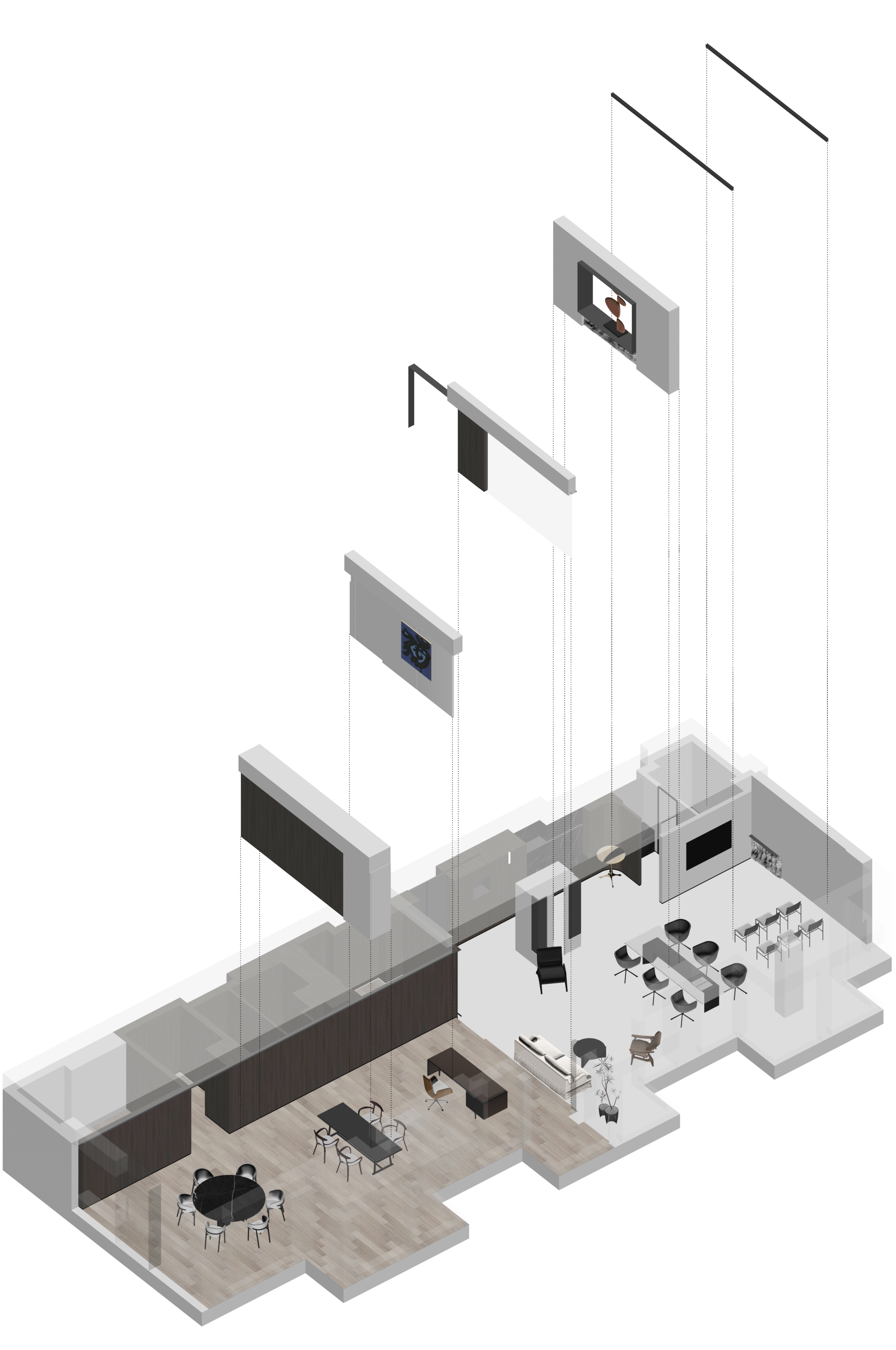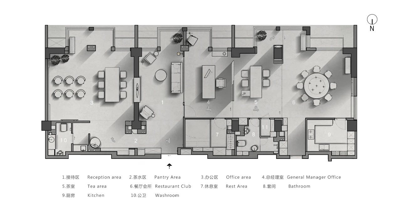 The independent office room connects with the reception area by floor-to-ceiling glass, which visually expands the space. The background wall finished with white artistic paint brightens the space, and outlines the background boundary to create spatial order. The hidden door of the independent office room leads to the tea area, and a sliding door links the tea area and the dining area. Both doors separate distinct functional spaces and protect privacy, and meanwhile form a temporary public passage when being opened. The reorganization of spatial order redefines working environment and experiences.