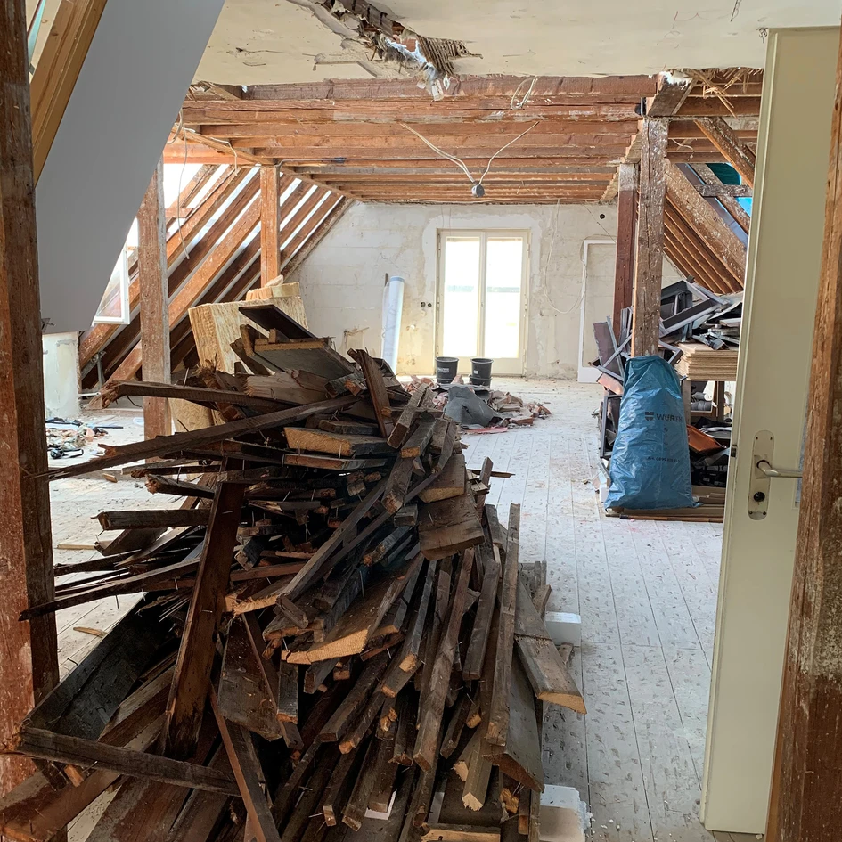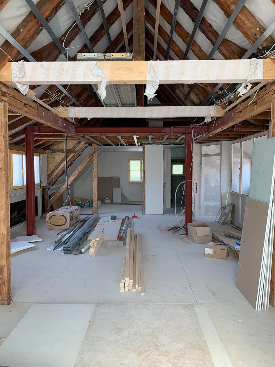 Rückbauarbeiten Wände, Decken und Böden, Dachgeschoß geöffnet bis zum Dachfirst, große Giebelverglasung mit Blick in die Weinberge, drei Wohnetagen EG/OG/DG mit drei Bädern und ein Gartengeschoss mit Gartenküche, Saunabad und Gewölbekeller.