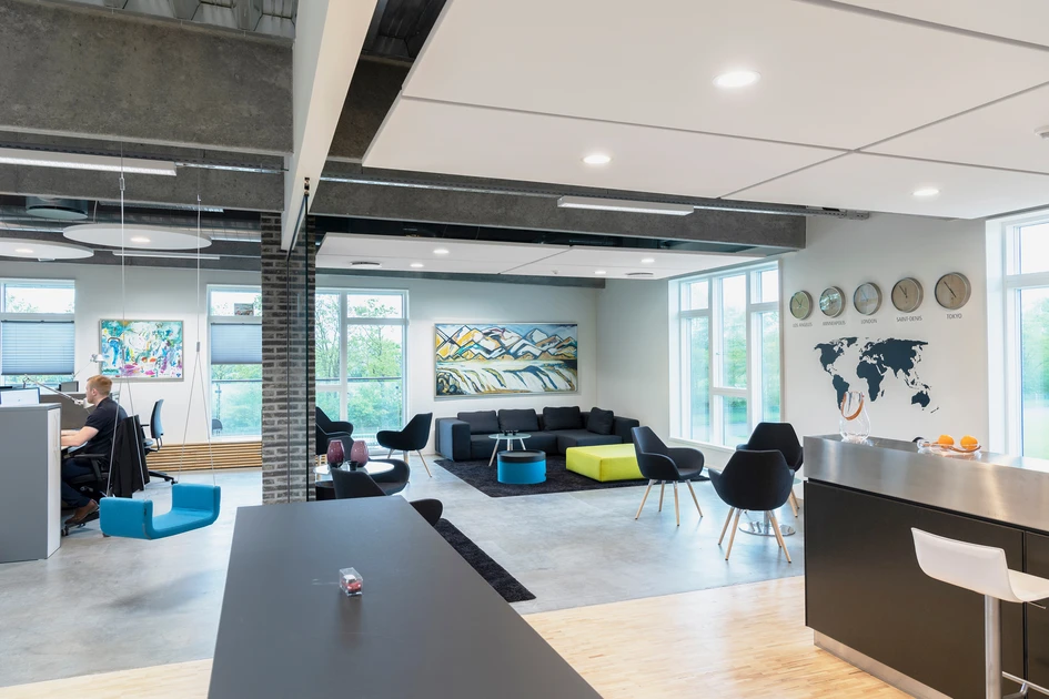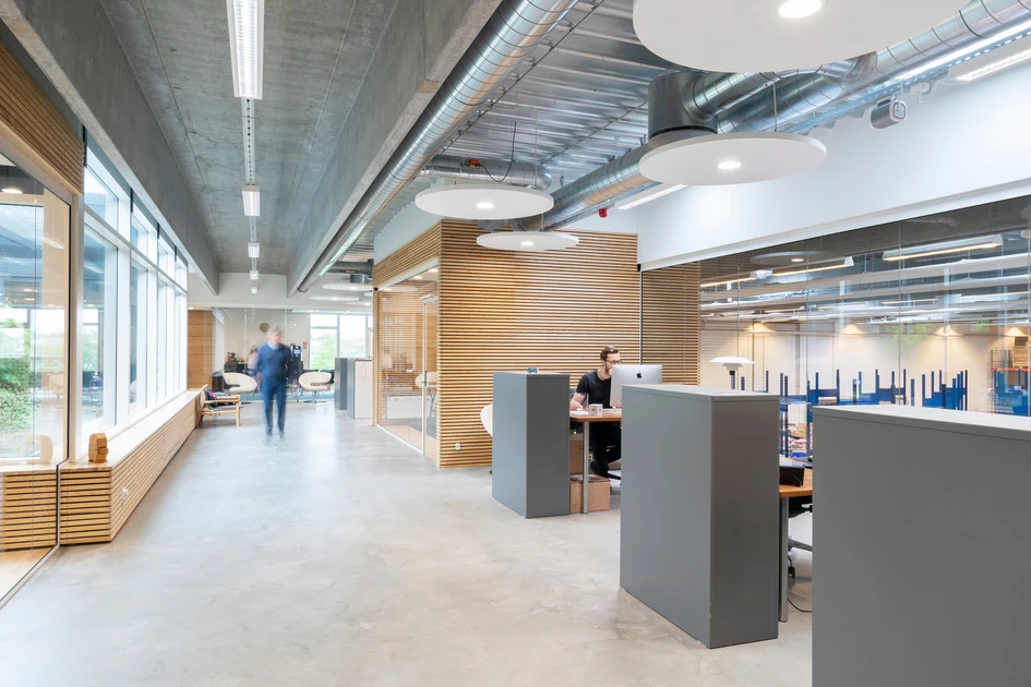 It places high demands on acoustics when former industrial premises are transformed into modern office environments while preserving the raw look. The architects at Bjørk & Maigård, therefore, chose to manage the reverberation time in the premises with acoustic rafts, when they transformed a 2,500 square meter warehouse building at Aars into a new office domicile for Kimbrer Computer.