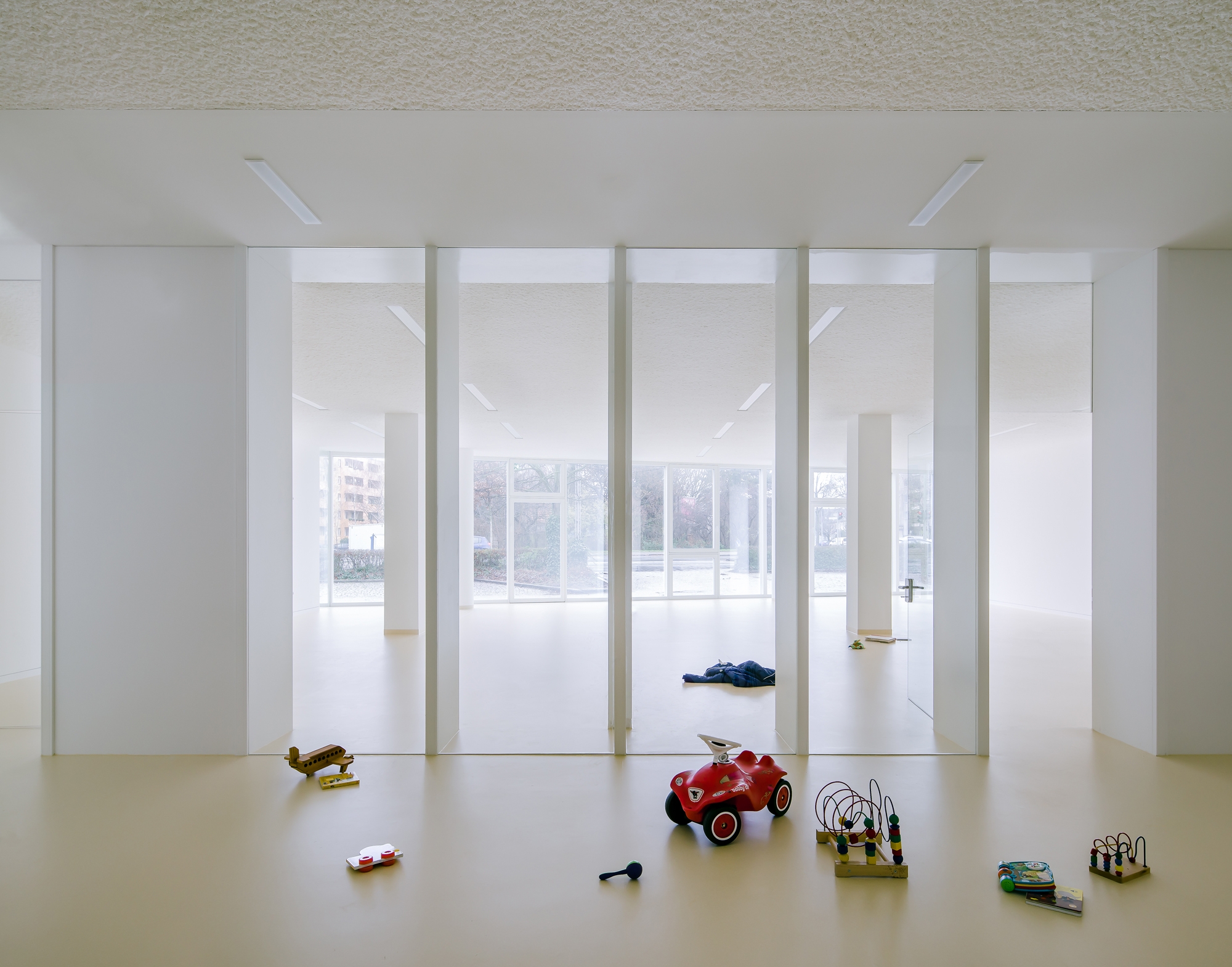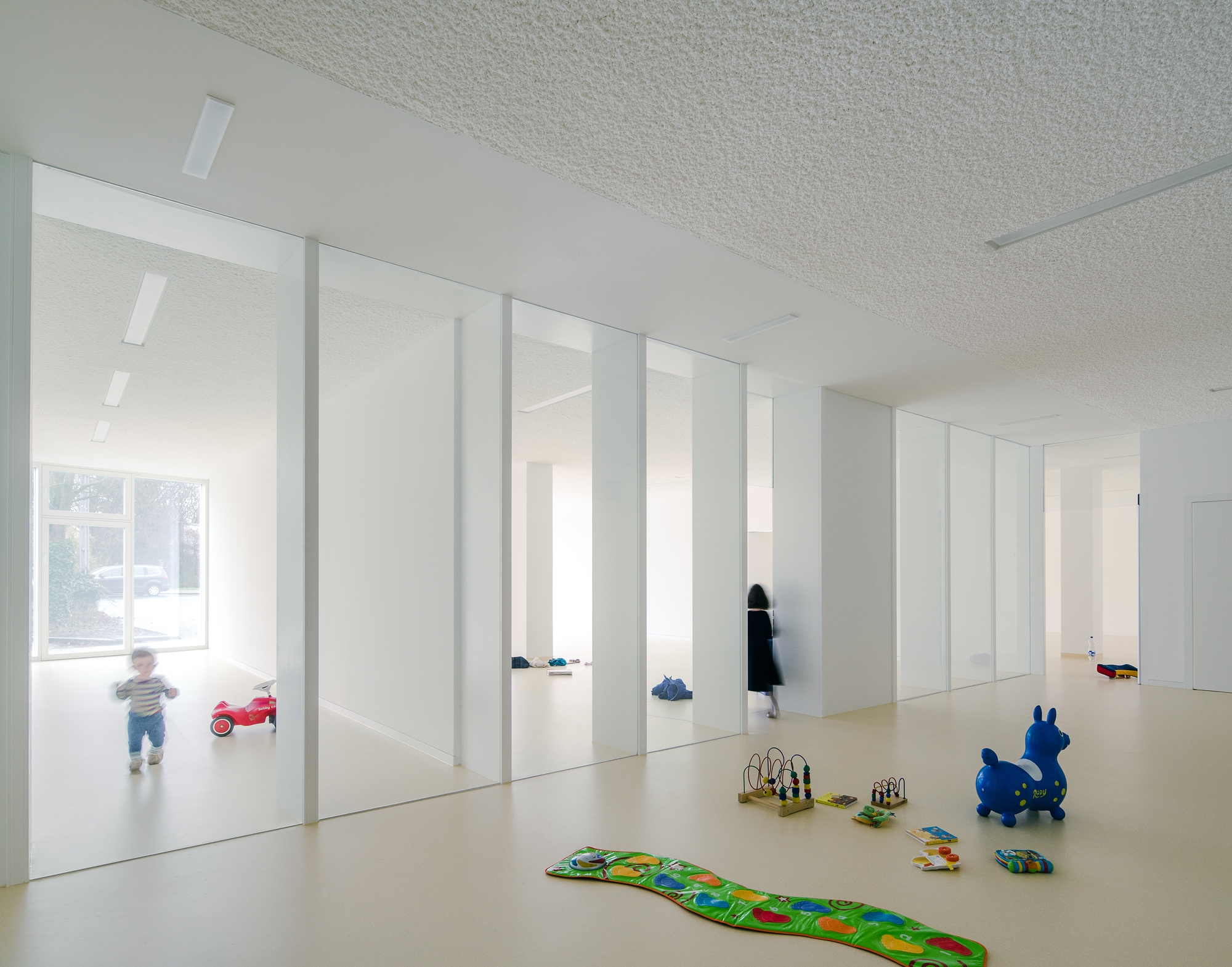 Transformation of a video library to a 750 m2 nursery. The one storey building of a former video library is - except of one longitudinal side - surrounded by soil. The original floor plan with its polygon shape and its unusual depth turns daylight to the essential aspect of the design concept.