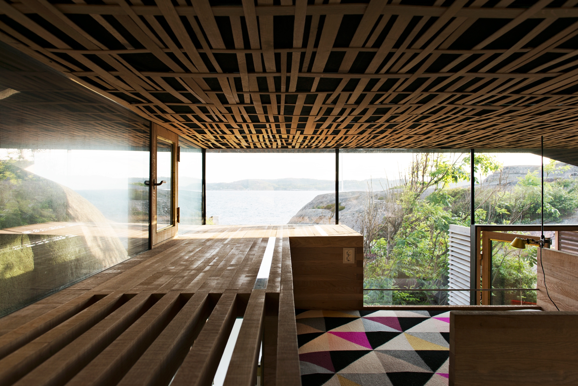 The east-facing atrium receives the morning sun; while the west-facing terrace opens towards the evening sun. The use of skylights takes further advantage of the long daylight hours experienced during the summer. Towards the cliff there is an opening in the roof, allowing daylight to pour down into the entrance and the bathroom. In the gap between the cliff and the concrete roof is protective netting that can also be used as a hammock.