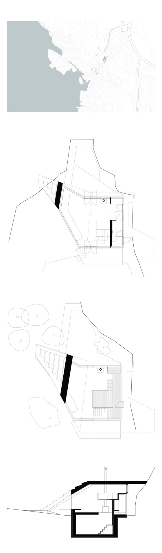 Accessible via a long boarded walkway, the house offers a sheltered atrium formed by the building and the cliffs. The project started with an idea of how to utilize this naturally sheltered area surrounded by large rocks and dense vegetation. The idea developed to create a way to climb up from this shelter to see the panoramic view over the sea, which led to the characteristic shape of the roof: a stepped ramp leading up from the terrain to the top of the roof, connecting to the landscape beyond.