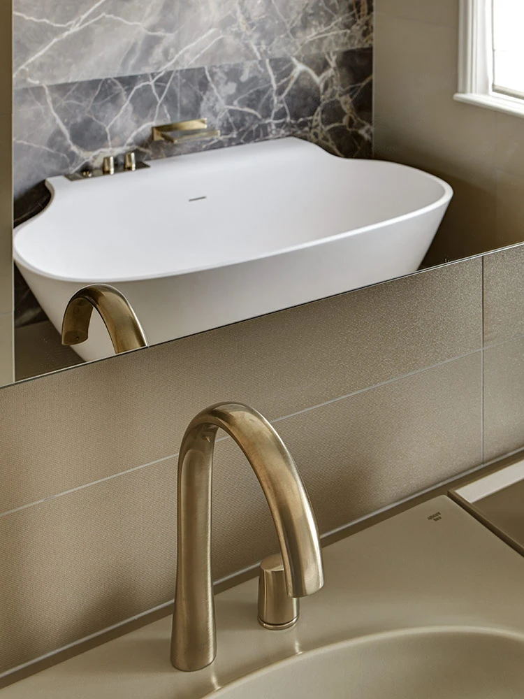 The stone floor and silk-clad walls of the hallway sets the material scene for the apartment. A hidden passage through to the private areas of the house allows for a user vs guest experience: function is always considered first, but as the apartment has such a focus on entertaining it was important to prioritise the sense of arrival. From the hallway, the kitchen can be glimpsed at the top of the stairs, and beyond it, the exceptional views onto the elegant garden. These important front rooms with their repeated windows are the perfect location for the house’s entertaining spaces. Symmetrical openings between these rooms in turn emphasise the central feature of the space: the remaining chimney breast. This strong vertical plane was clad in vals stone on all sides and a double sided contemporary fireplace (its opening size dictated by the existing flues) added a function and focus for both rooms. Continuity between reception, dining room and kitchen was further achieved by the seamless flow of chevron wooden flooring delicately detailed with ebony borders and a bronze inlay. The exceptional layered selection of textures, materials and decorative lighting create a compelling yet calm journey from one space to another. In the private spaces the walls are softened with textured silk and linen and clever joinery conceals modern conveniences. The bathrooms are another exercise in subtle drama: characterful stone contrasts against thoroughly modern ceramics from Armani Casa with beautiful rose gold brassware accents.