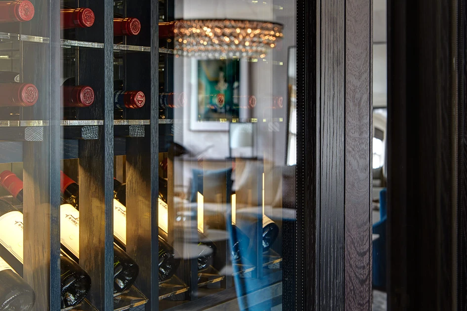 The restaurant grade kitchen was another mark of the client’s appreciation of excellence in engineering and innovation in interior design. The kitchen was considered on one level to act as a background view from the hallway and, with its monolithic veined stone island, is a dramatic sculptural still life. In motion, however, it is a kitchen designed for use by a home cook or professional chef with Gagganau appliances, a flush mounted extractor and a beautiful glass wine fridge as one of the views from the dining table completing the sense of being at the chef’s table in an exclusive restaurant.