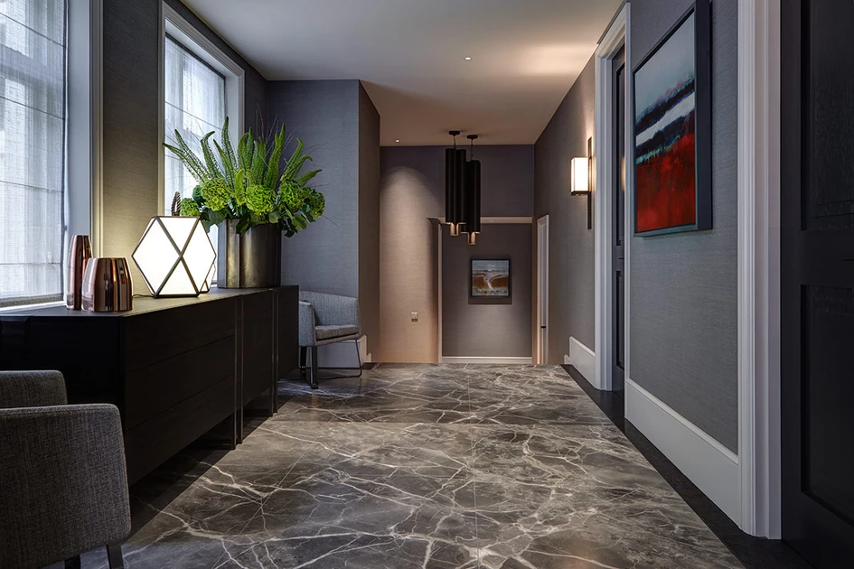The fusion of the two distinct properties was successfully achieved at the most important level through the rationalising of the layouts and flow between the spaces. Early on in the design process we spoke about the importance of creating a sense of arrival that would announce (or rather, whisper) the status of the apartment and set the tone for the rest of the journey through the spaces. The location and creation of the generously proportioned hallway was the foundation. The unifying palette of beautifully veined marble with bronze inlay and dark border was introduced in this early space, together with the neutral but textured silk wallpaper that would feature elsewhere in the apartment. The enveloping aesthetic is impossible to ignore. A cocooning, dramatic hello is immediately achieved: dark framed tall doors offer intriguing possibilities, but the vista of the monolithic kitchen island with its globe of lights above suspended above a dark dining table draws the visitor up the stone stairs into the heart of the home.