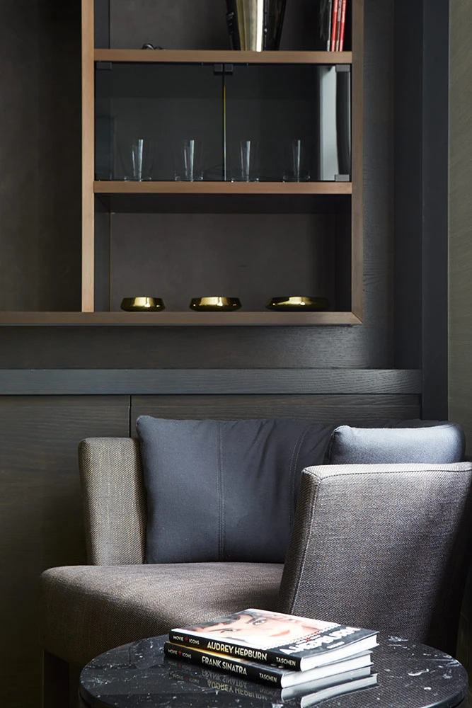 As designers, we always try to find the unique red thread in each of our projects. The red thread is the creative DNA that runs through a piece of work. It is unique to each project and comes from the particular mixture of the client’s story, the architecture and the wider environment and setting. The red thread in this property turns on the subtle interplay of masculine and more decorative materials, and is expressed conceptually in the dramatic monolith of the kitchen island, the planes of Vals Stone in the connecting living and dining room fireplace and the large striking elements of joinery with their accents of bronze and sliding panels of subtly decorative horsehair. Function is at the heart of the house and these elements are all at work in some way: decoration is essential rather than whimsical.