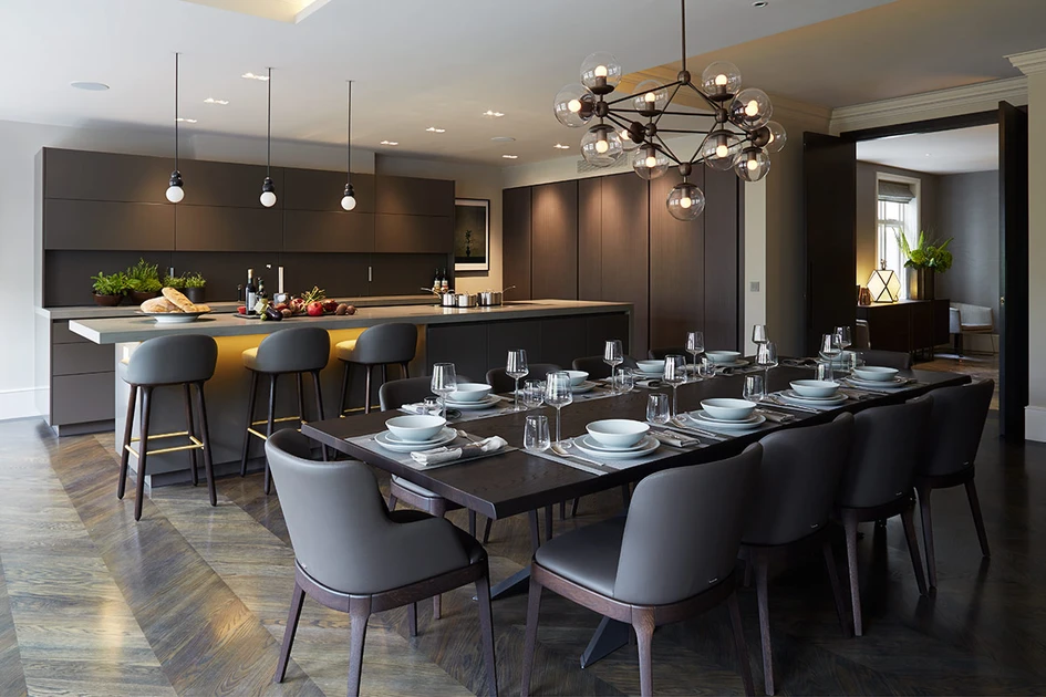 The location of the open plan kitchen and dining room was another key decision to satisfy the client’s brief for a home designed for entertaining that felt as though it had been originally laid out in its new form. The two principal rooms of the former apartments provided exceptional views onto the elegant garden: the perfect location for the new home’s series of entertaining spaces where the client’s desire for open-plan cooking and dining could flow seamlessly through into a multitasking reception room (a concealed multi-media experience was a key client requirement).