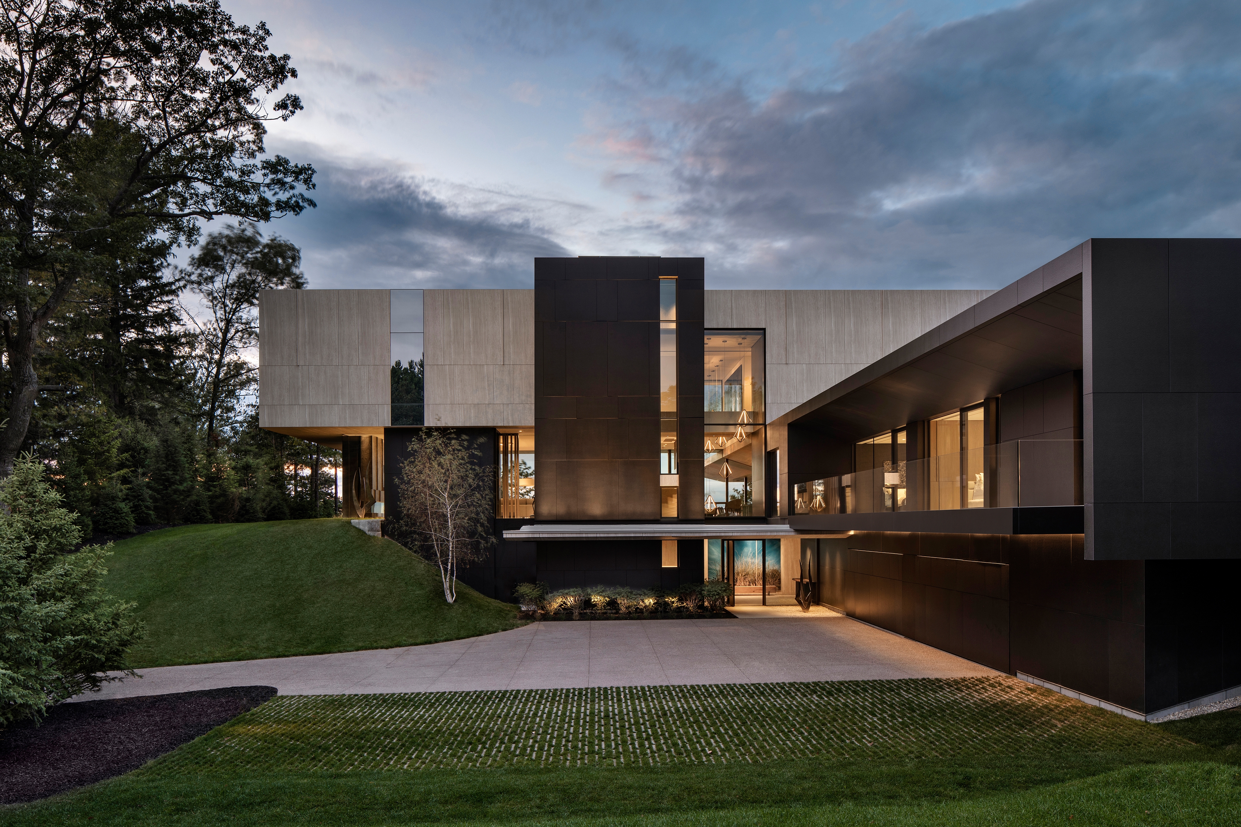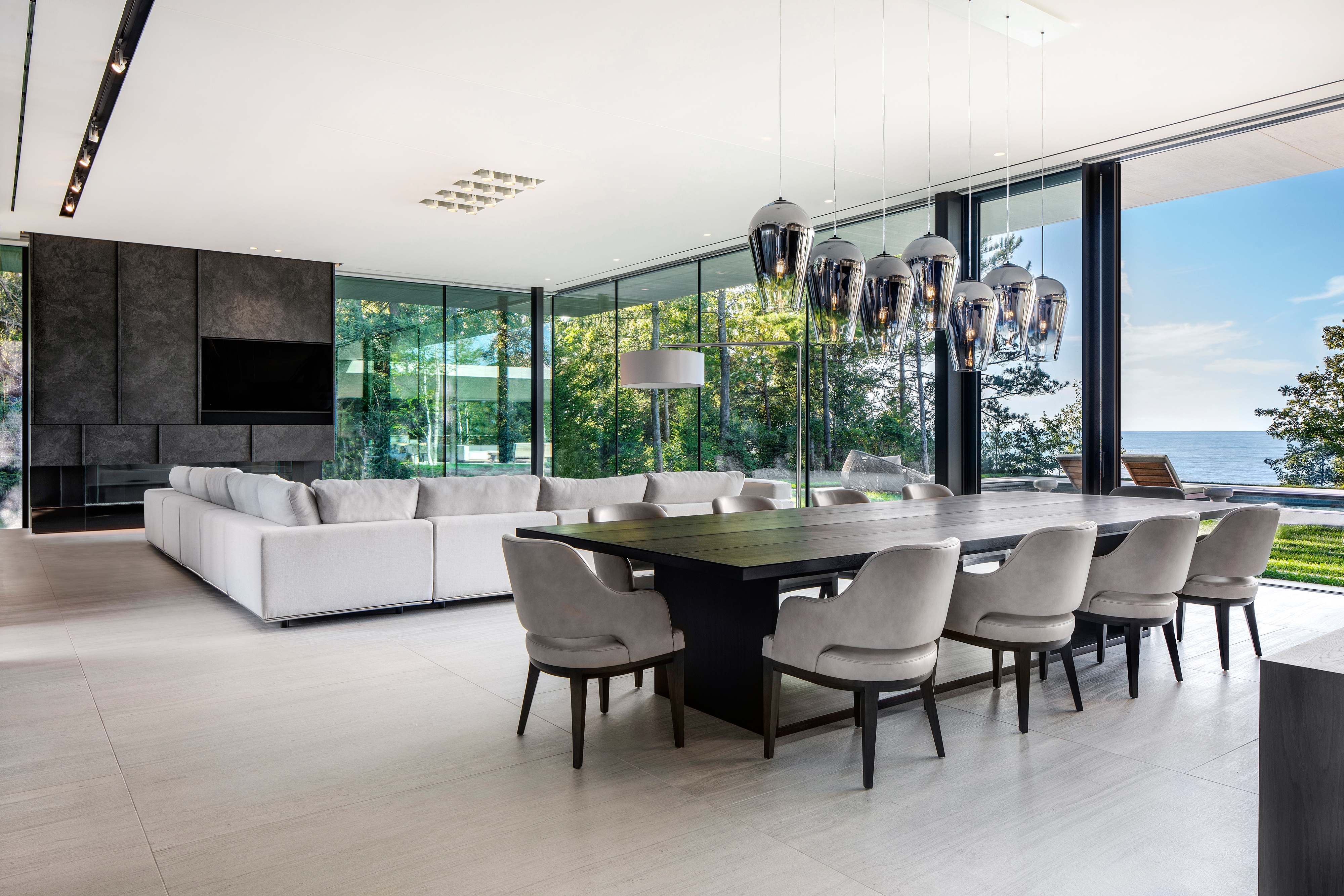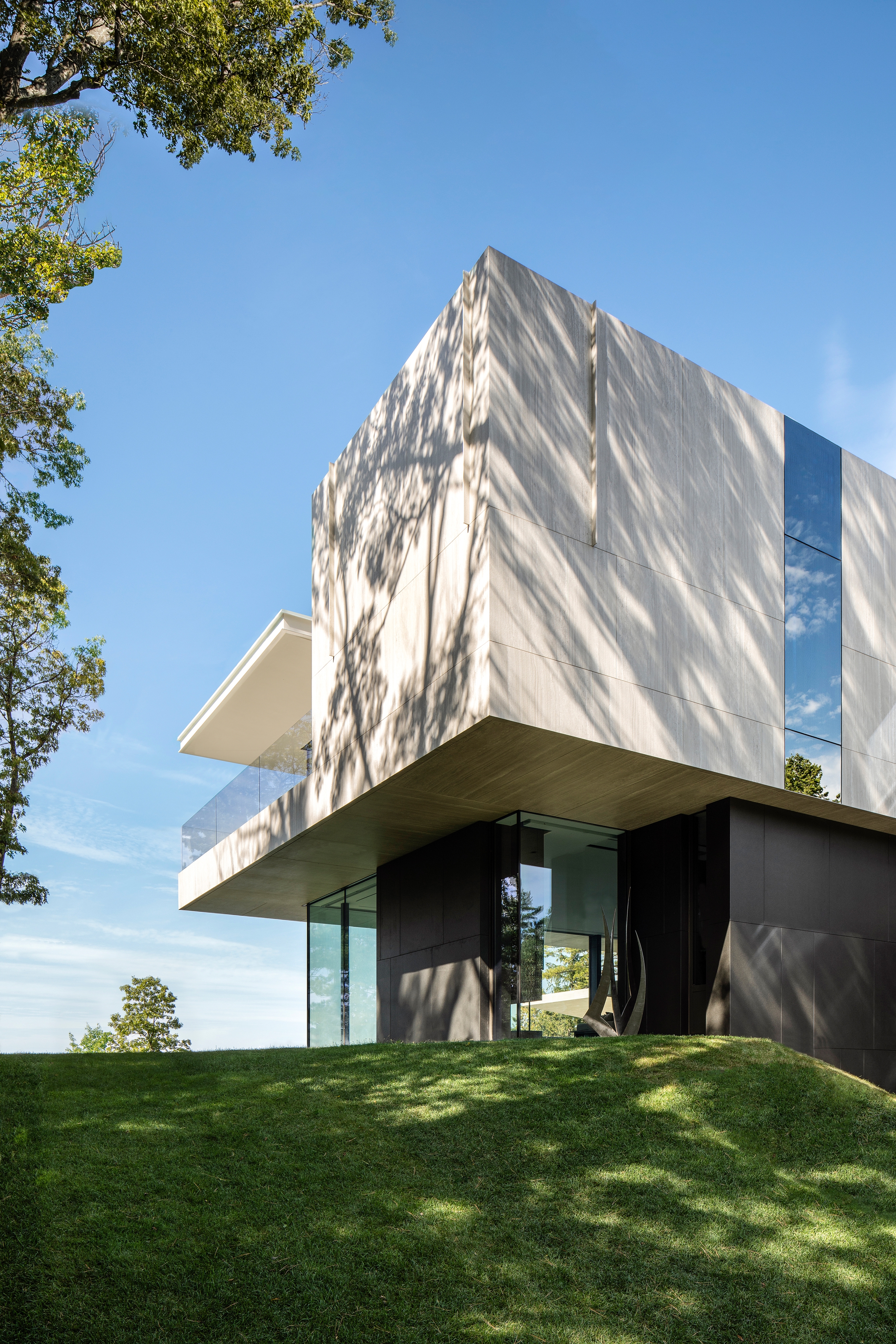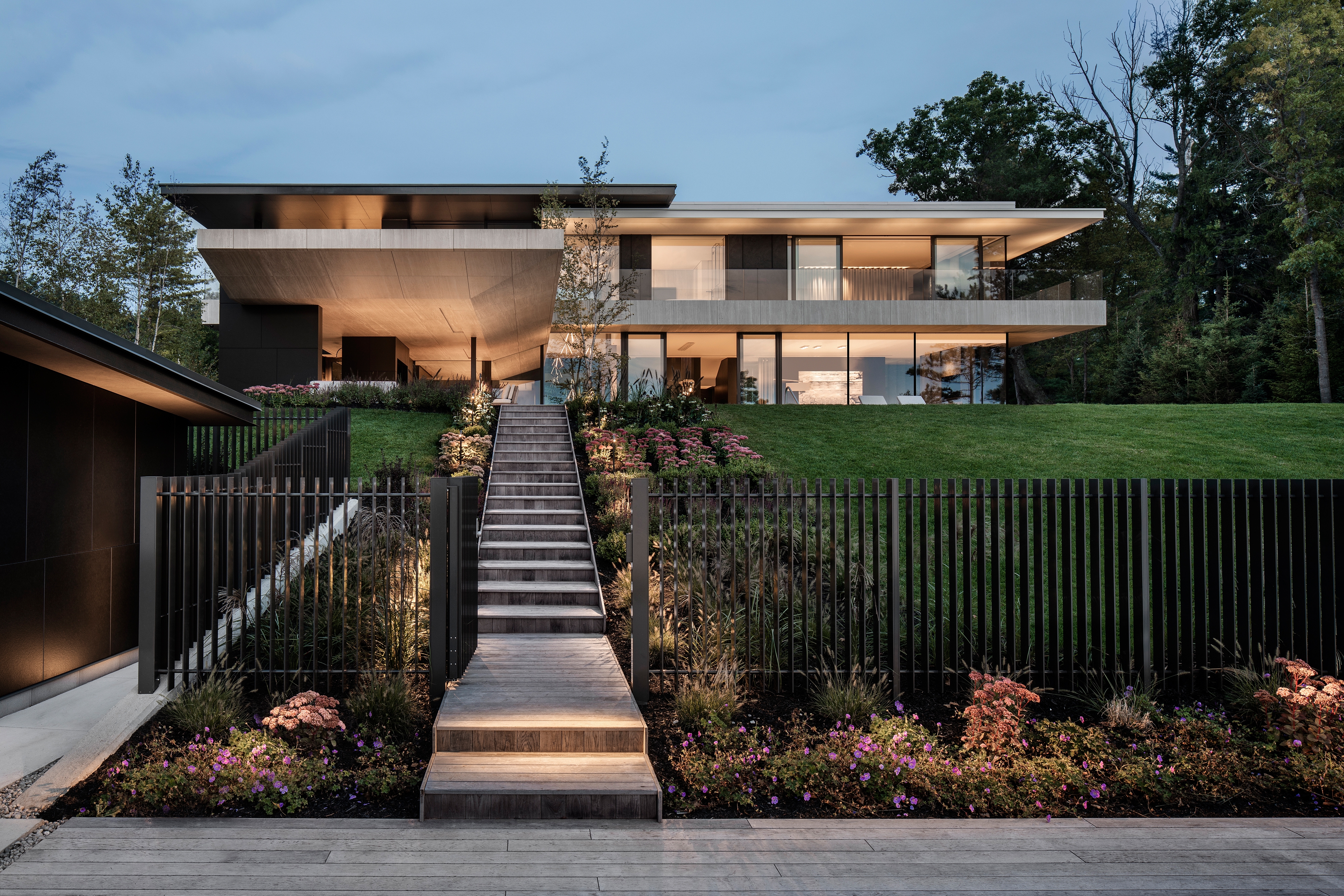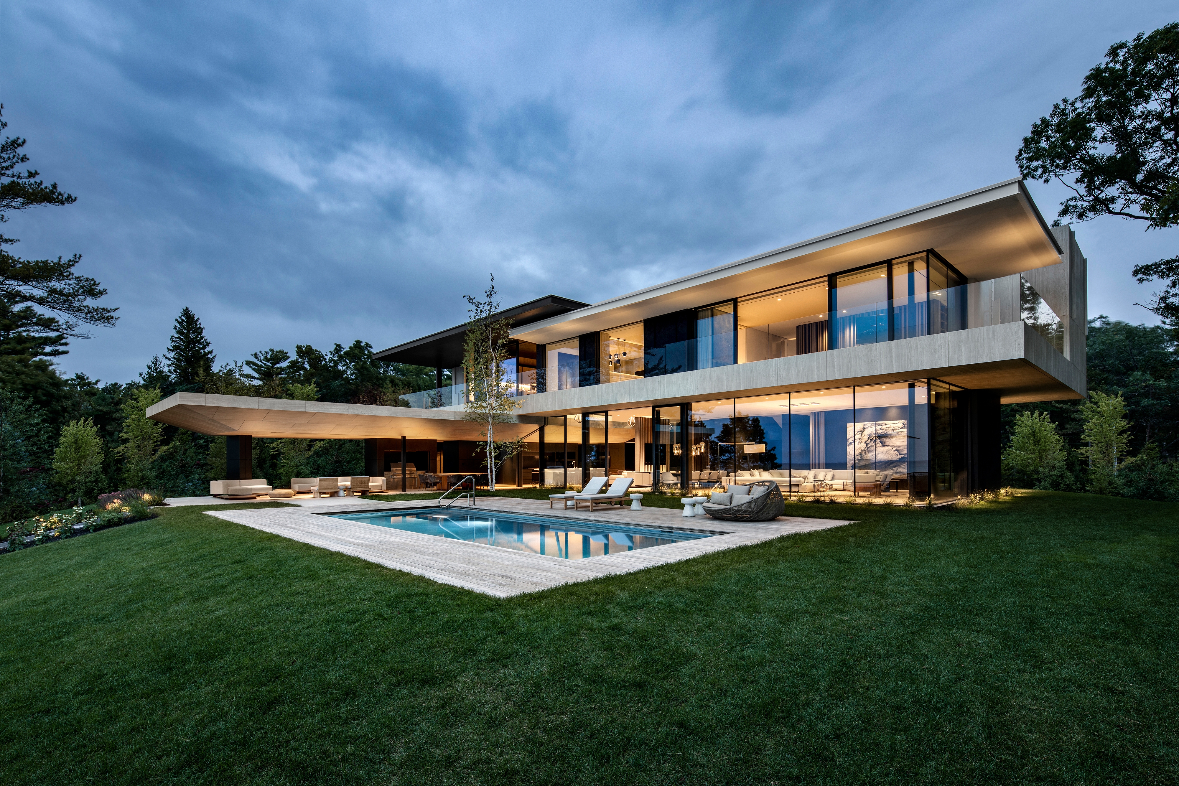 The site is a bluff occupying the transitional space between water and forest, rising 3.5m from road level and then dropping down to the water to create a grassy embankment. The building is set back on the property towards the street to preserve the natural bluff. On approach, the house is largely concealed by the surrounding mature fir trees, appearing as a simple light-coloured stone box floating effortlessly between the tree trunks. The rear of the house, facing Lake Huron, dissolves into a two-storey wall of glass washing natural light deep into the interiors.
