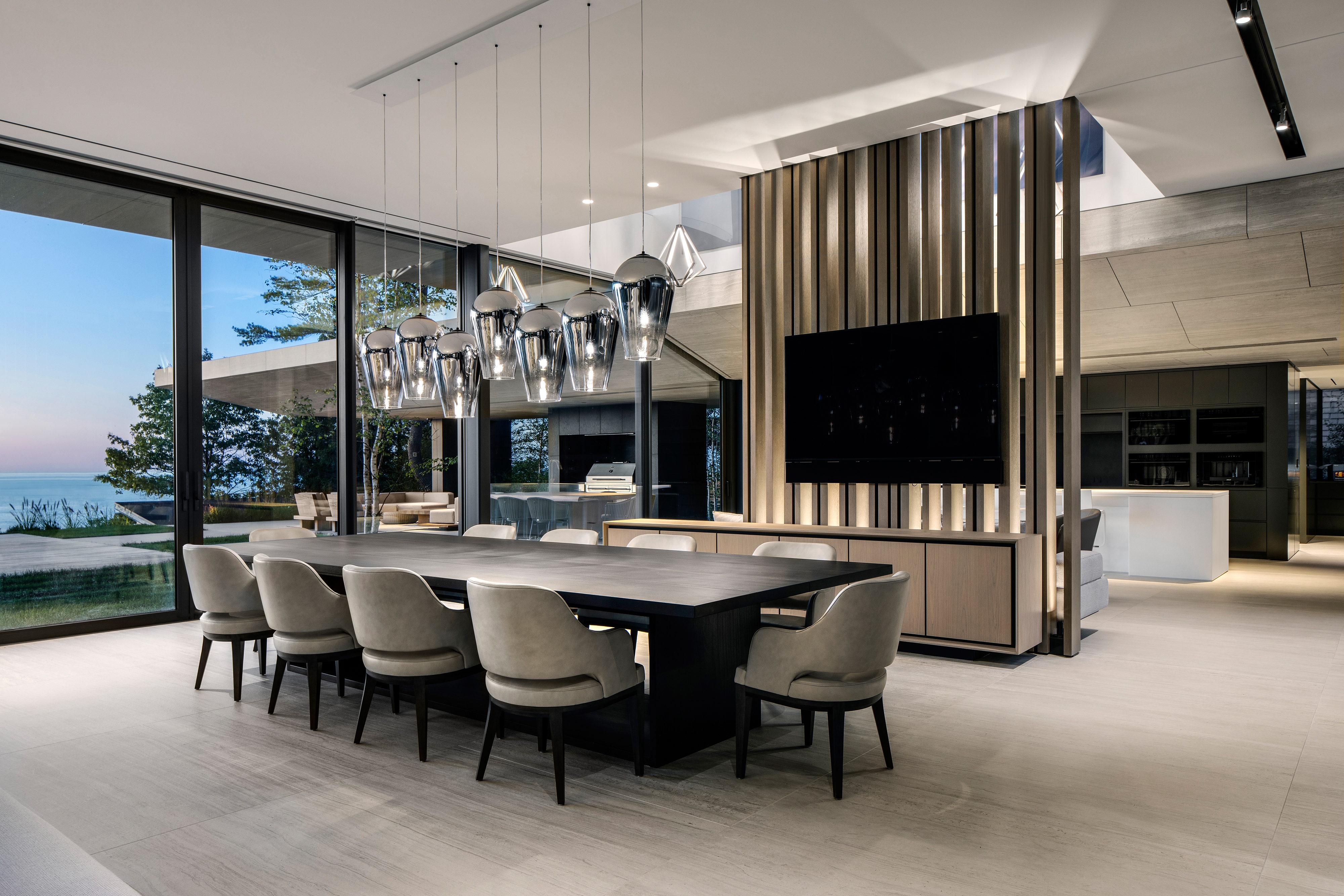 The upper-level housing the master bedroom is devoted entirely to the owners’ private space, including an office and a gym. To the front of the house, a covered outdoor entertainment area flanks a swimming pool. A boardwalk and staircase descend to a refurbished cabin that predated the house, and now houses a guest suite and additional outdoor entertainment area to facilitate long summer days playing on the lake.