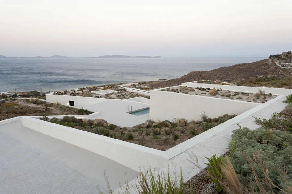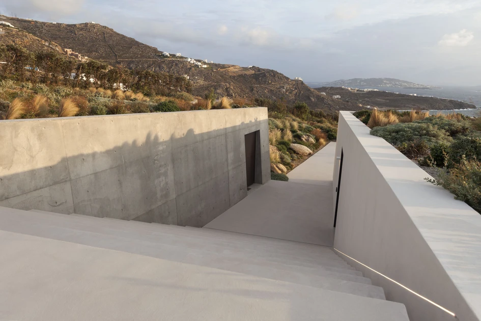It is sheltered by a planted roof and has a southern orientation overlooking the Aegean Sea. The outdoor parking spaces are also covered with a planted roof so that the presence of cars is not detectable from above.